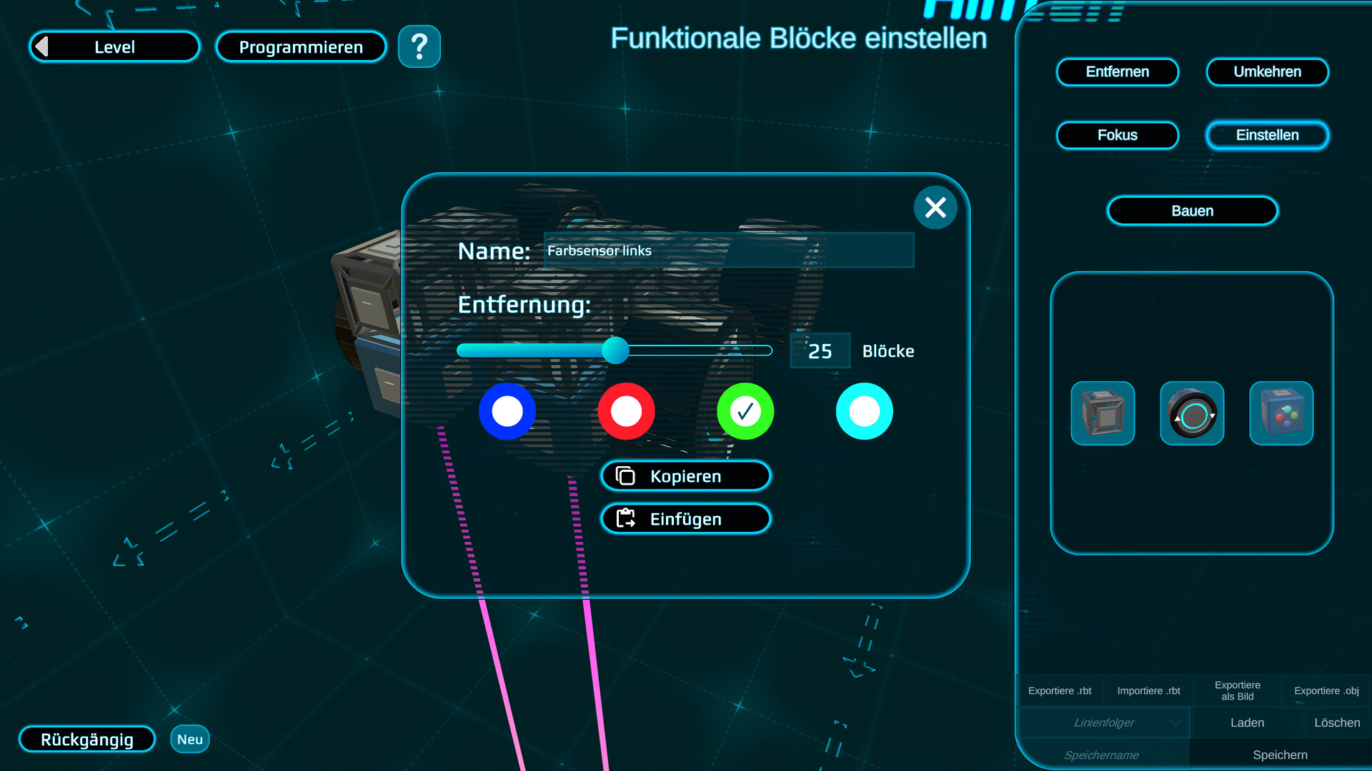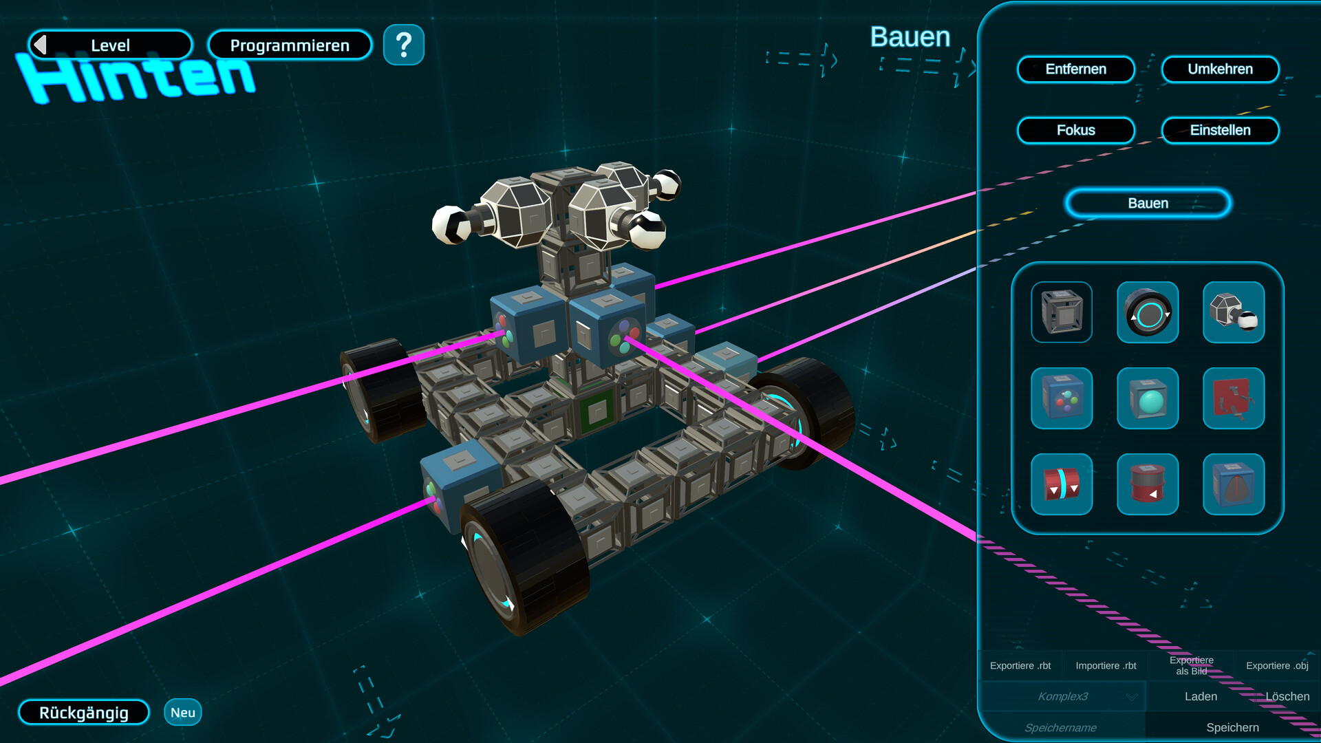 Wähle aus verschiedenen Bausteinen und setze deinen Roboter zusammen! Passe ihn darauf an, was er im Level erledigen soll! Räder erlauben es ihm, sich zu bewegen. Sensoren geben ihm die Möglichkeit, seine Umgebung wahrzunehmen. Greifarme ermöglichen es, Gegenstände aufzuheben und mitzunehmen.