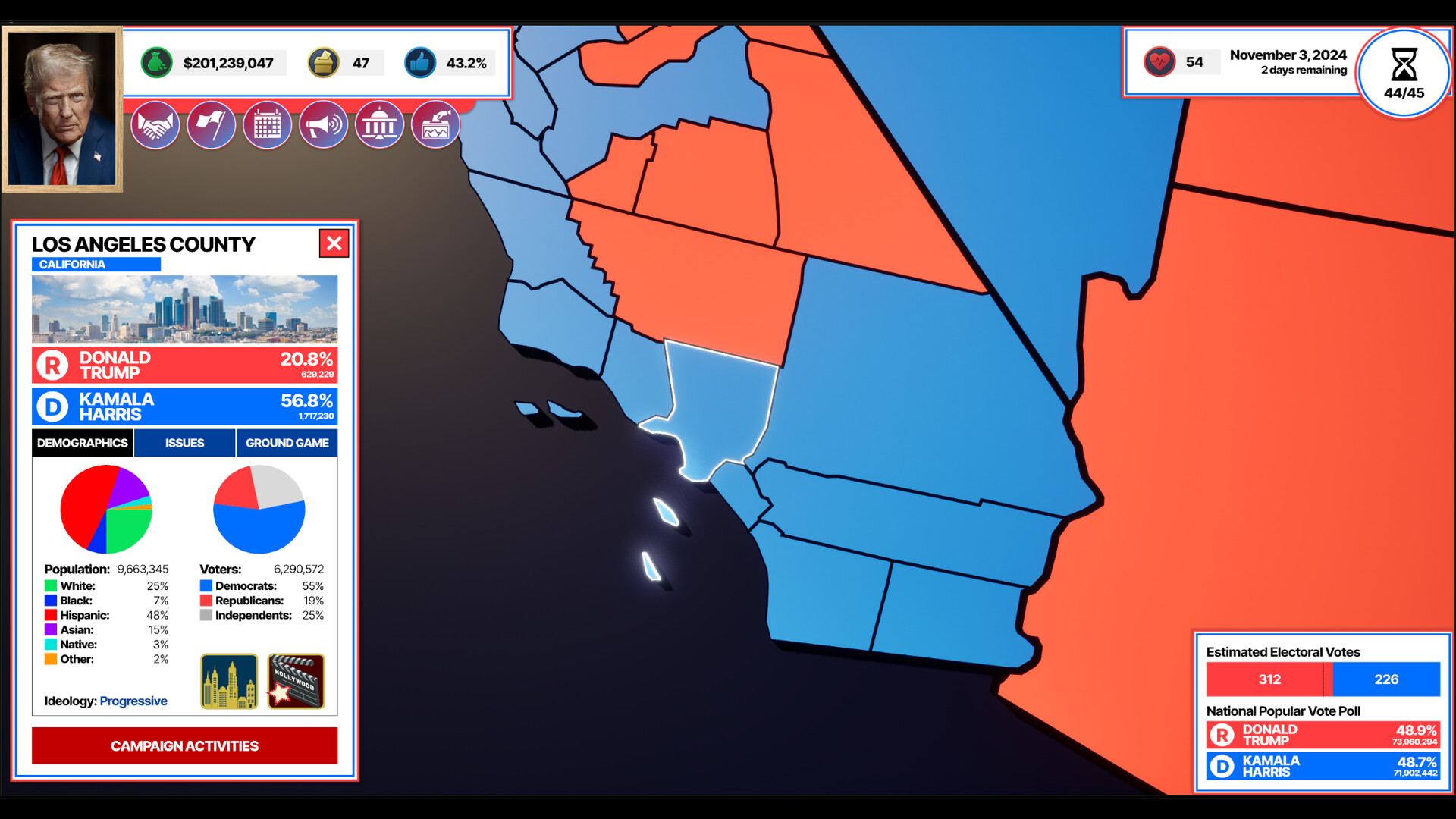 Plan your weekly moves and adapt to new conditions. Open field offices, build volunteer networks, buy ads, and schedule events in any county and state you see fit. But don't run out of money!