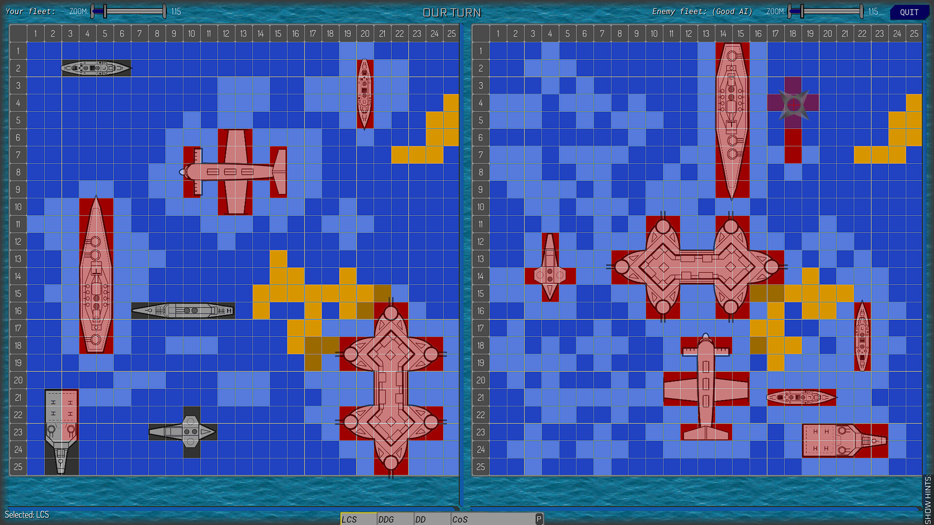 A classical game, but with a twist! 20 different ships, each with an interesting damage pattern. Fight on a battlefield with customizable size and possibly also islands. Play against AI of many difficulties or other players.