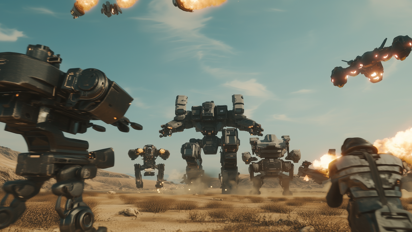 Play as a sentient AI defending a landing zone on a post-human Earth, fighting off relentless waves of machine enemies. Build and upgrade turret defenses, mine resources, and survive the onslaught while switching seamlessly between FPS combat and RTS command view.