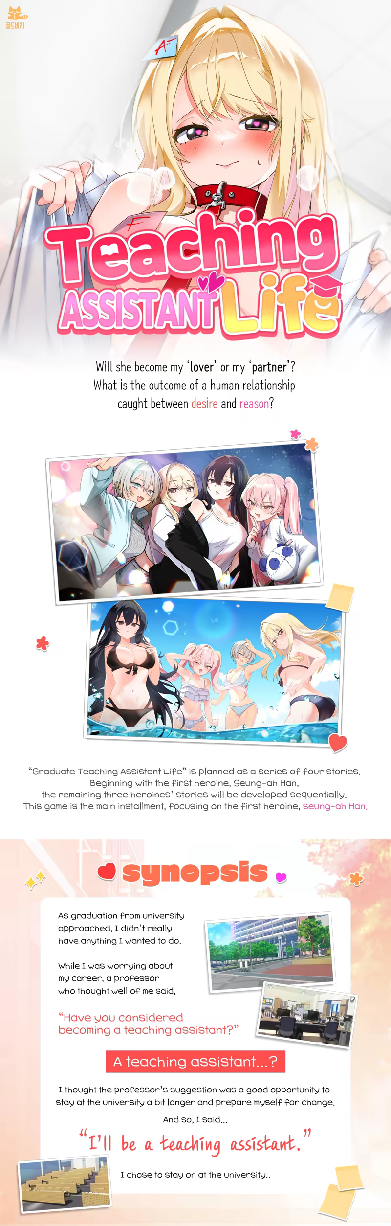 <College teaching life> is a story about the passionate teaching life of the main character (player), who is a college assistant. Be a player and enjoy the sweet and sexy relationship with the first heroine of the series, Han Seung-ah!