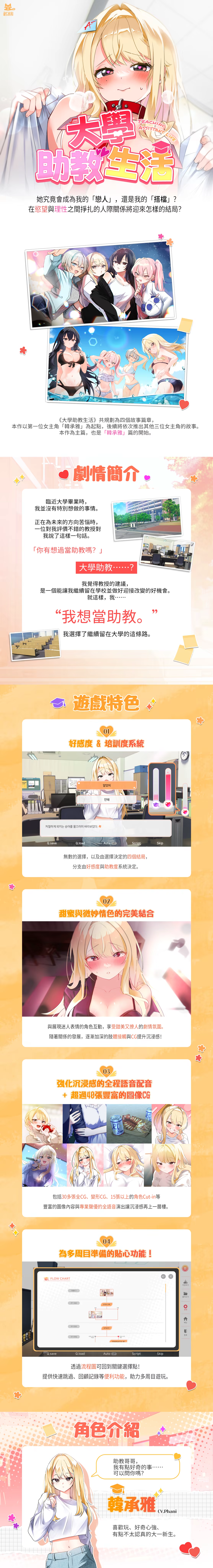 <College teaching life> is a story about the passionate teaching life of the main character (player), who is a college assistant. Be a player and enjoy the sweet and sexy relationship with the first heroine of the series, Han Seung-ah!