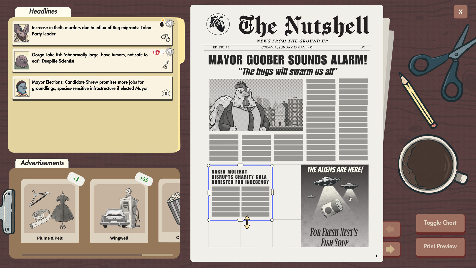 Launch your newspaper and sway the masses in a unique animal world! Direct reporters, plan stories, blow up Headlines for Impact and throw in Ads for Profit. With every faction gunning for a piece of your front page, how far will you go to keep your paper in print — and yourself out of trouble?