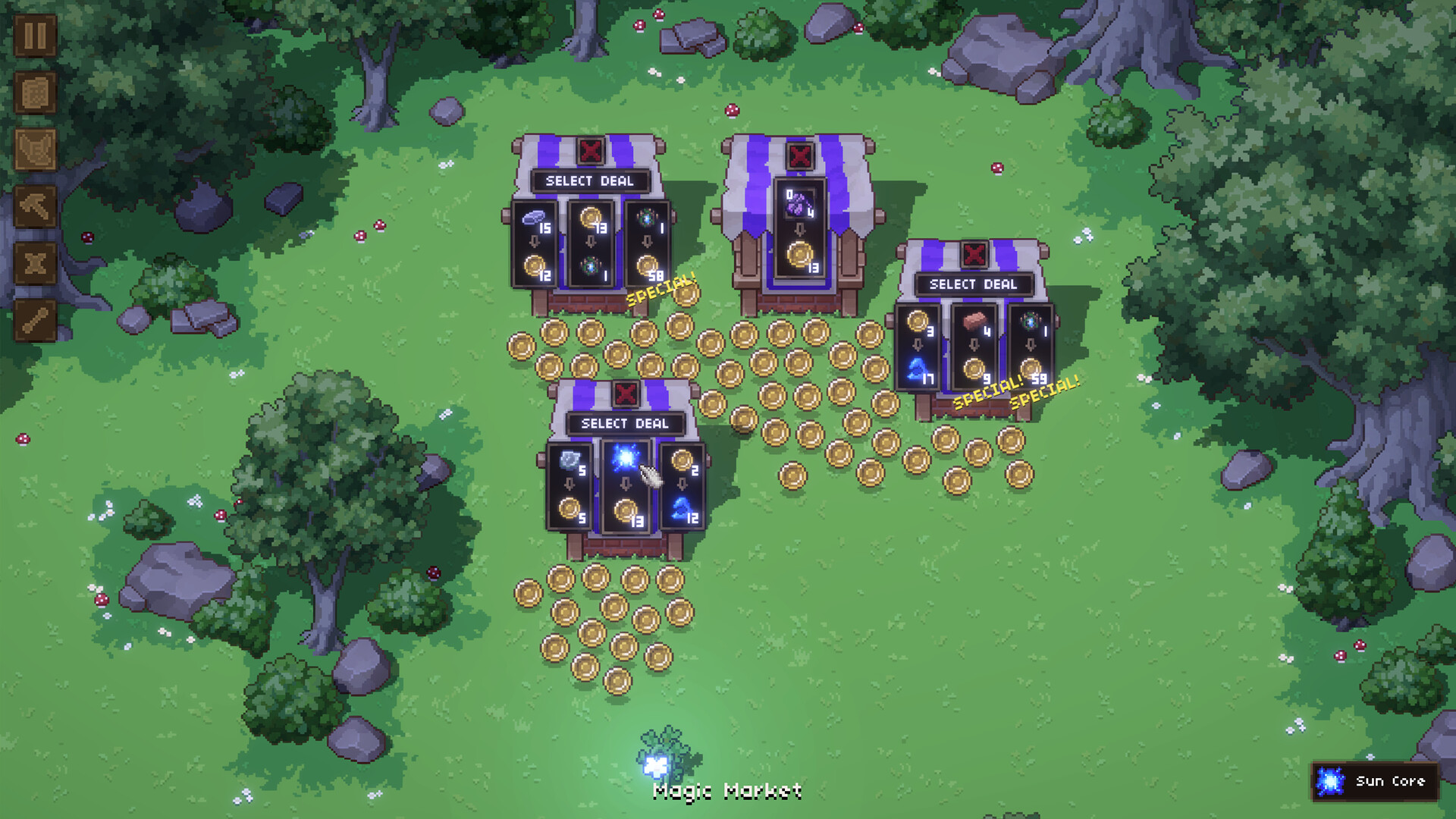 Progress through a magic skill tree to unlock the secrets of the glade. Collect items and refine them into powerful magical resources. Use these items to build your own productive base. You can farm crops, slay monsters and automate your alchemical production on your journey to uncover an all-powerful artifact.