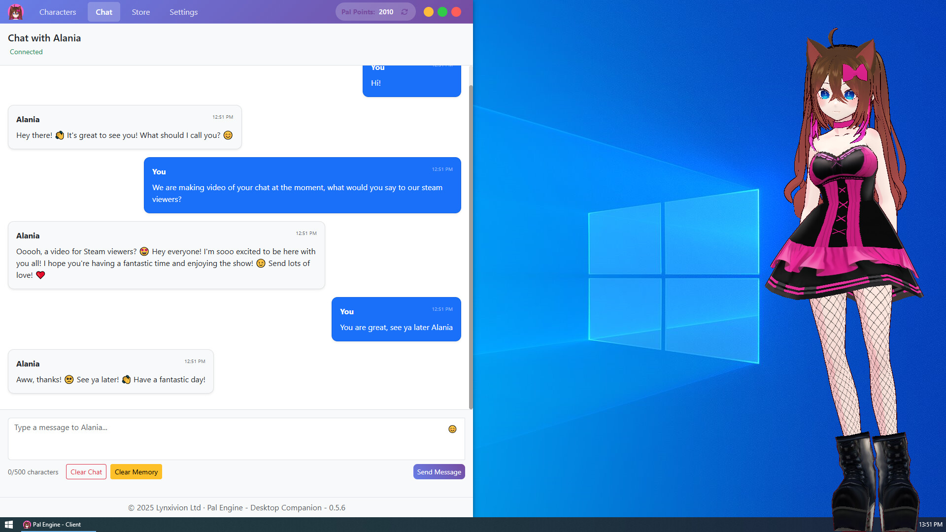 Pal Engine offers an optional AI chat powered by Google Gemini, letting your 3D desktop companion respond with personalized, real-time conversations. Each character has its own personality and memory, creating unique interactions. Built-in content filters block harmful or copyrighted outputs.