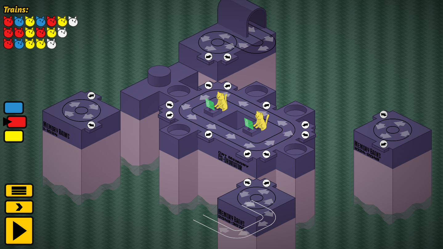 A fun logical puzzler, the game is all about working on a solution, the correct design that will 'process' multiple configurations of cat trains. Cats can only travel on tracks that are the same colour as the cat itself (of course) and the cat at the front of the track decides where the whole train will go. Once a cat has traveled along a coloured track, it flies away, as cats are well known to do. The goal is, for every train, make all the cats, including the white one at the end, fly into the ether.