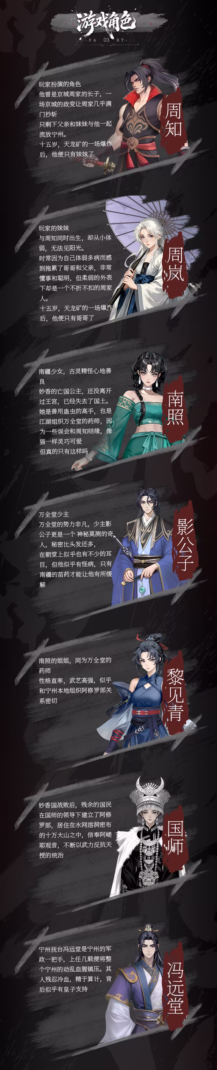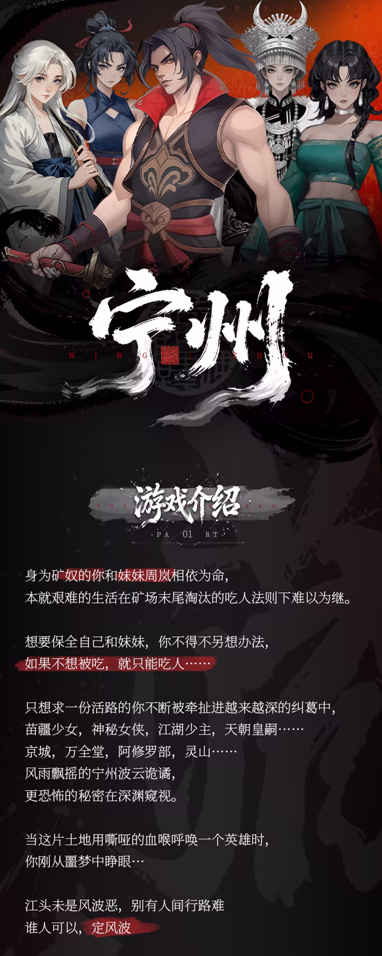奇幻架空的热血恋爱AVG游戏——玩家将扮演男主角,与苗疆少女,神秘巫女,江湖少主,天朝皇嗣等各色人物产生故事,从一个矿奴逐渐成长为一个英雄。30w+剧本,多个可攻略角色,多分支结局。架空但严谨的世界设定,充满弧光但鲜明的各色人物;脑洞大开但动人的剧情发展,来玩一下吧,求求了QAQ