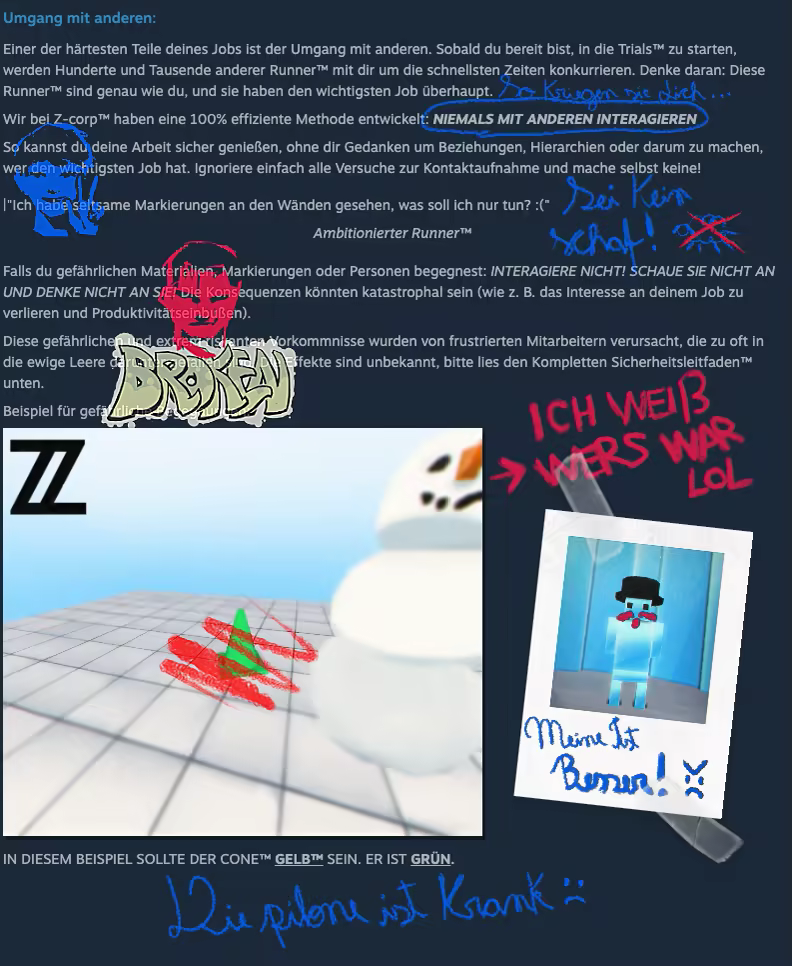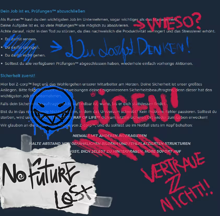 Z-CORP™ REKRUTIERUNG! Berufsbezeichnung: Runner™ / Dauer: Unbefristet. Erforderliche Fähigkeiten: Gute Parkour-Fähigkeiten, starke Ausdauer, absoluter Gehorsam gegenüber Autoritäten. Um sich zu bewerben, installieren Sie bitte zuerst das Spiel. – Z