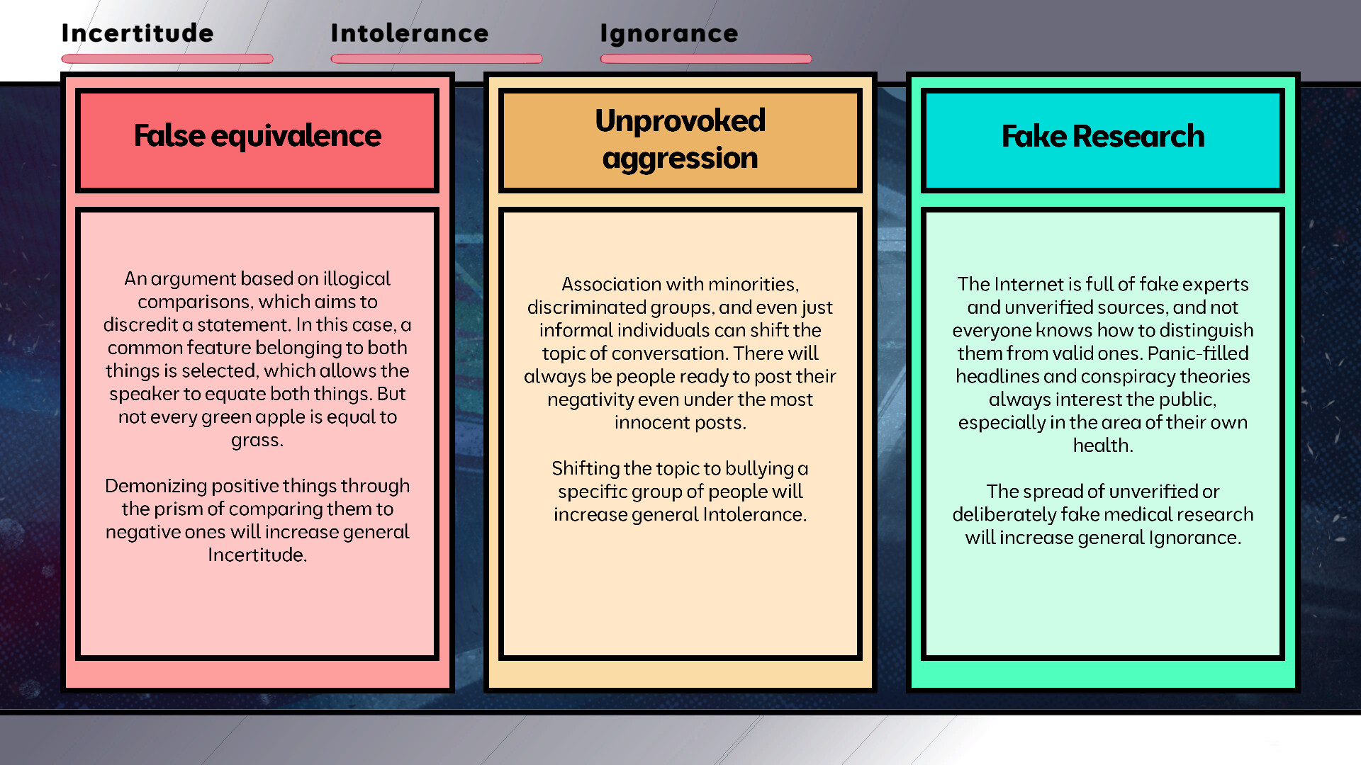 - A glossary explaining common disinformation practices, with illustrative examples of how successfully propaganda can affect ordinary life.