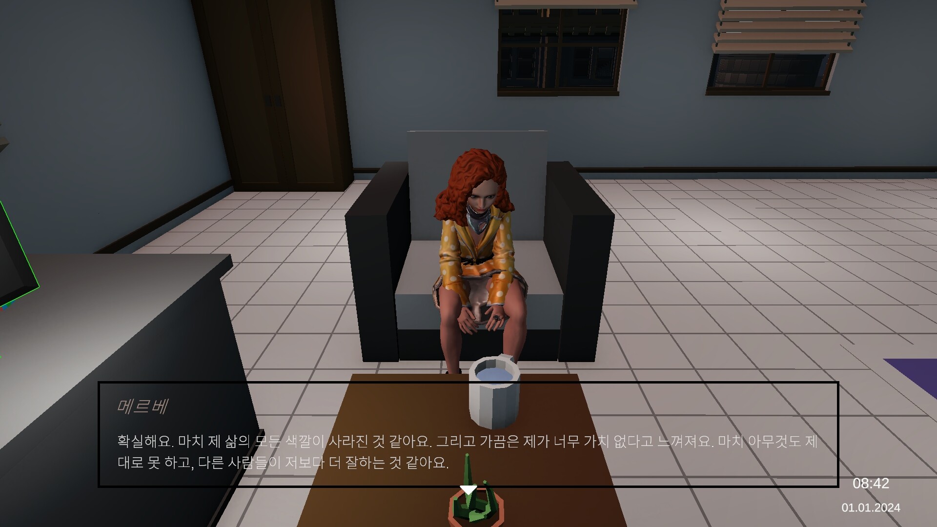이 게임은 심리학자와 환자 간의 대화를 통해 성인들을 위한 민감한 주제를 다룹니다. 우울증, 불안, 트라우마, 자살 충동과 같이 심리적으로 고통스러울 수 있는 주제들이 포함되어 있습니다.