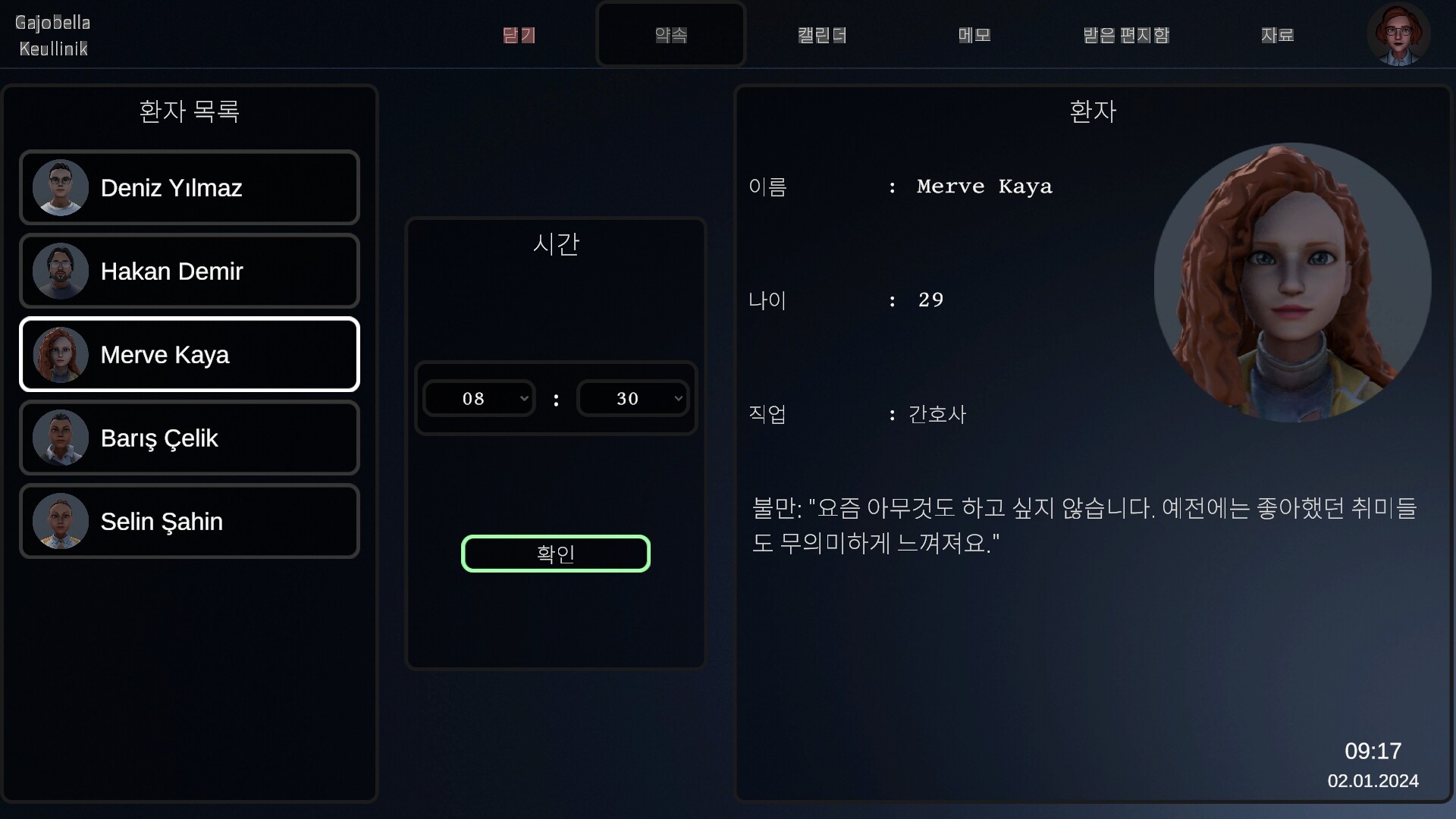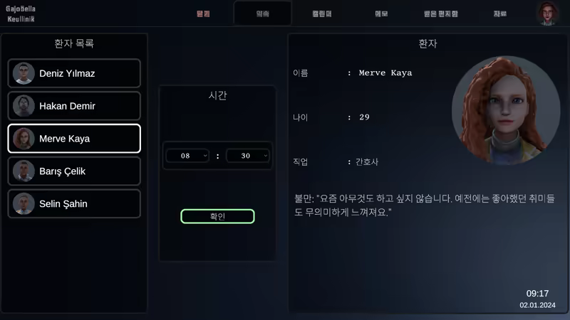 • 전략적인 예약 및 시간 관리: 여기서 시간은 스톱워치가 아닌 예약 달력으로 측정됩니다. 한 환자를 치료하는 동안, 항상 시계와 다음 예약을 주시해야 합니다. 예를 들어, 오전 8시 환자의 치료를 낮 12시 환자가 도착하기 전에 끝내야 합니다. 그렇지 않으면 다음 환자는 나타나지 않고, 그날의 임무는 실패하게 됩니다. 따라서 어떤 시간에 어떤 간격으로 예약을 잡을지는 전적으로 당신의 전략에 달려있습니다.