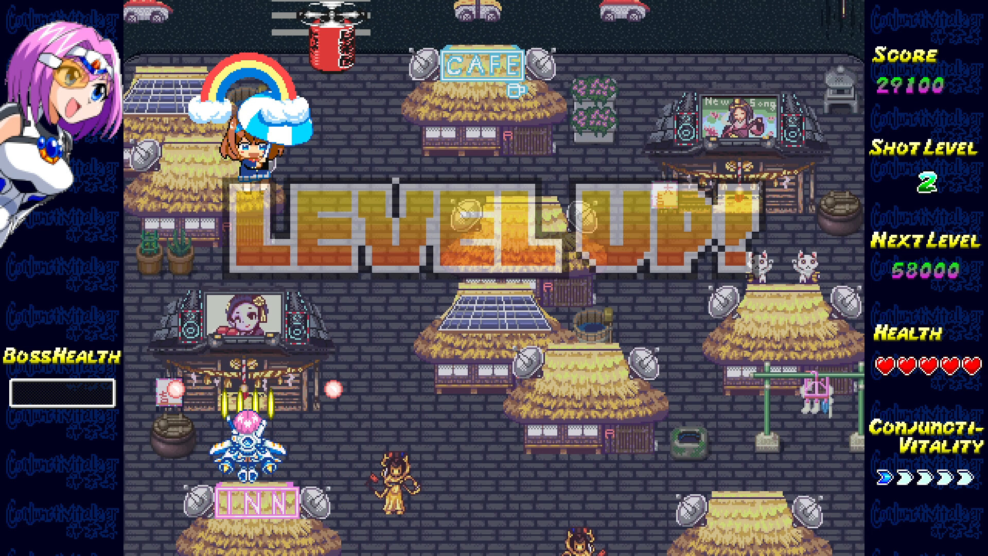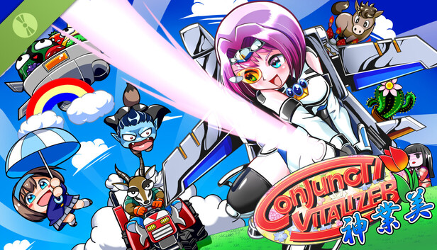 Not only does Conjunctivitalizer offer a completely fresh method of gameplay and scoring, but it's also filled with bizarre and zany enemies. Fruit bowl spaceships, dango mochi birds, flying cacti and gazelles riding tractors are just a fraction of the characters you'll encounter. Still not enough? Conjunctivitalizer features an OST by game music legend Yamanaka Toshiya, whose previous works include Star Cruiser, Bakuretsu Muteki Bangaioh, and Sin & Punishment.