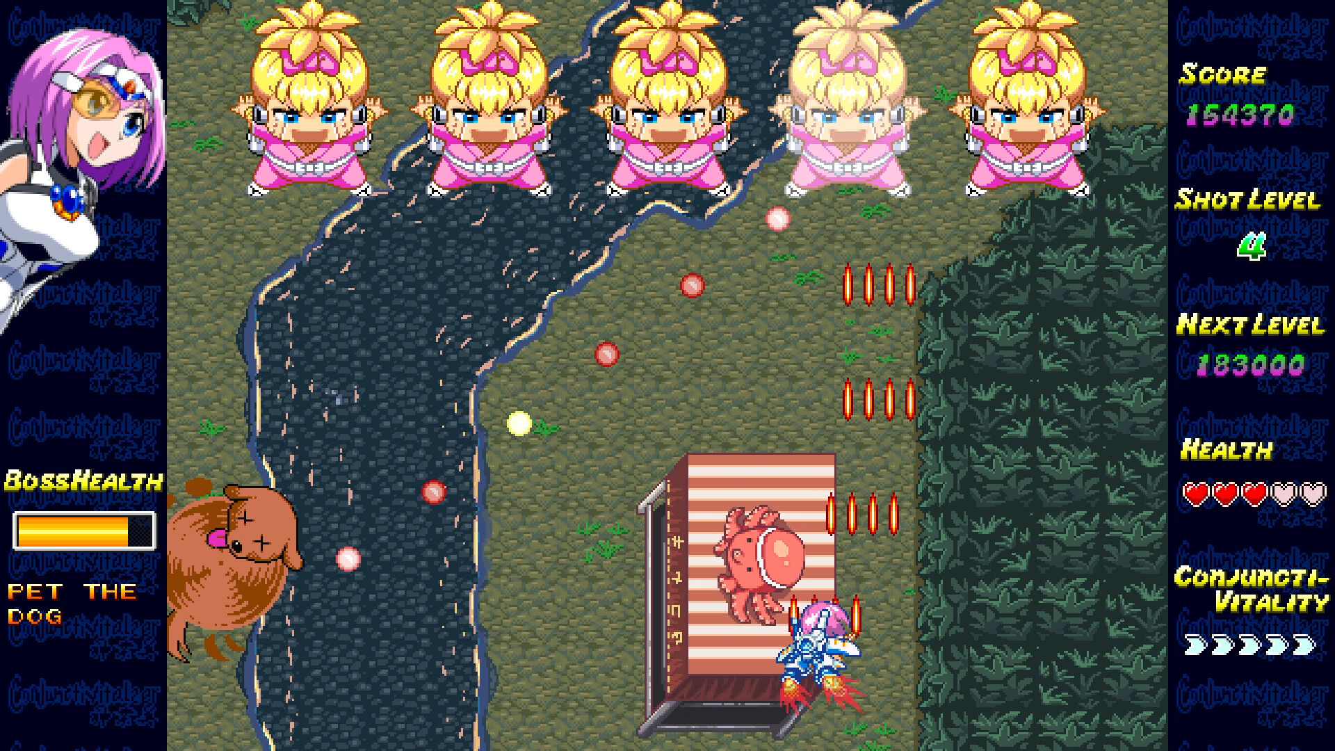 In addition to a standard and wide shot, the player is equipped with a sword, but this sword isn't used to defeat enemies melee style. Instead, it has different effects on enemy bullets depending on their color. Blue bullets can be reflected back for added damage, yellow bullets can be absorbed into your conjunctivitality meter, and red bullets - run like hell.