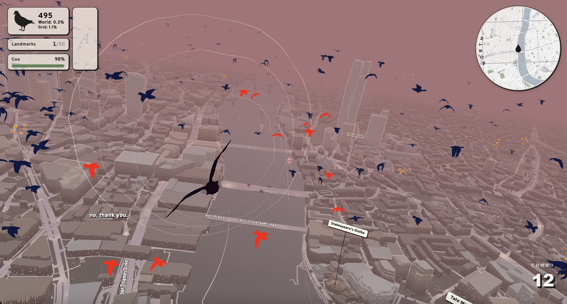 es un juego en el que vuelas sobre réplicas a escala real de ciudades icónicas en busca de tu alma gemela con forma de paloma.