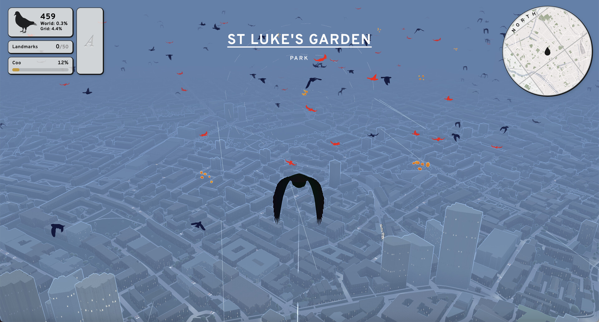 es un juego en el que vuelas sobre réplicas a escala real de ciudades icónicas en busca de tu alma gemela con forma de paloma.