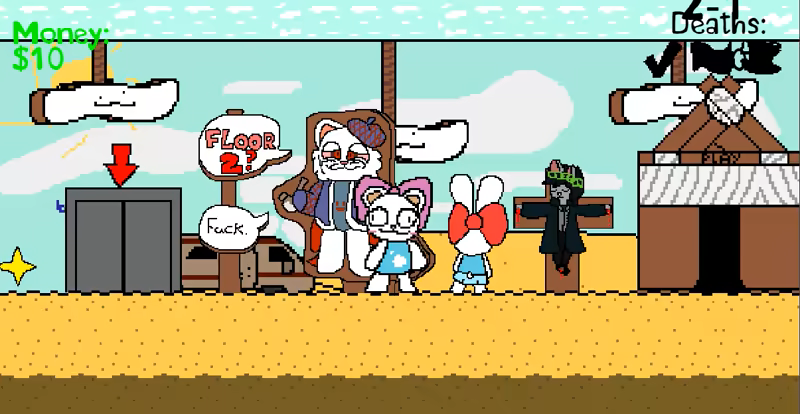 Welcome to "Rinny Platformer Rage Game"! A game inspired by a completely different series "Pretty Blood" with a completely different tone from this trash. (NOTE: THESE CHARACTERS ARE RETAKES ON THE OG ONES MADE FOR PRETTY BLOOD, WE NO LONG AFFILIATE TO IT DUE TO THE CREATOR OF THE SERIES BEING A CREEP) Make friends (dont)! Explore (not much)! Die (90% of the gameplay)! Again and again! All jokes in this game are satire and should not be taken seriously. So stop reading and play, In any case, this game is divided into several sections and the development is also divided into those sections. Please be patient!