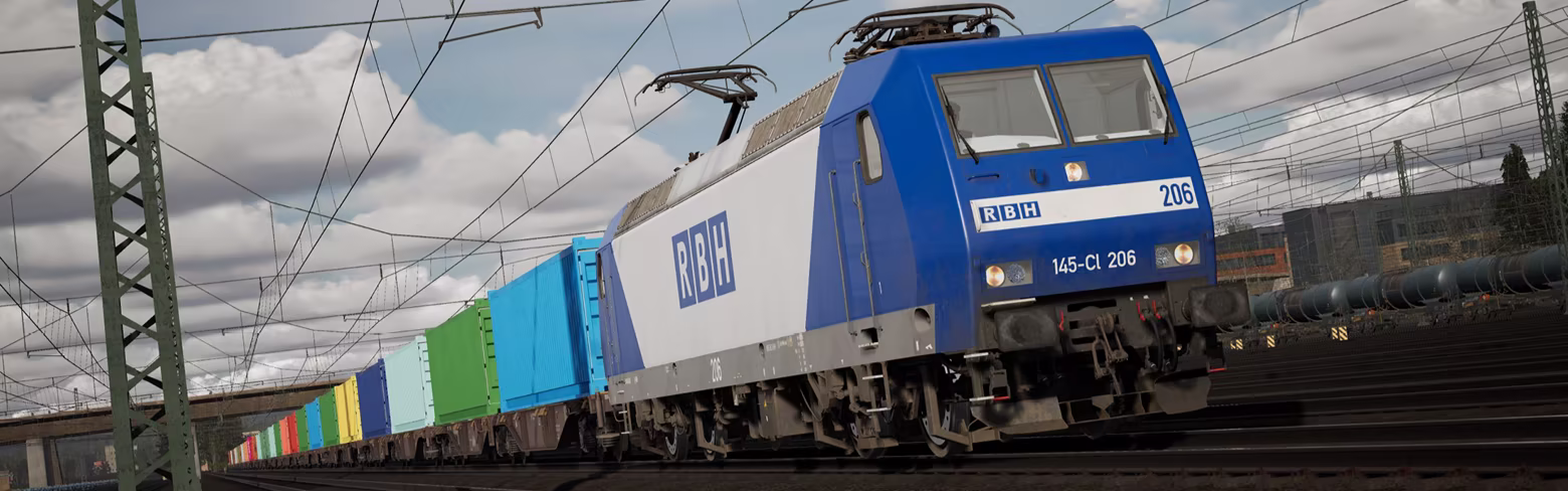The BR 145 features not only the standard Deutsche Bahn livery, but RBH blue as well - a new freight brand for Train Sim World. The “NV” variant of DB BR 145 is also included representing their limited use as passenger locomotives. Brand new T3000e container flats also feature, alongside Expert-upgraded versions of existing and commonplace wagons; the Zacns, Habbiins and Sggmrss 90.