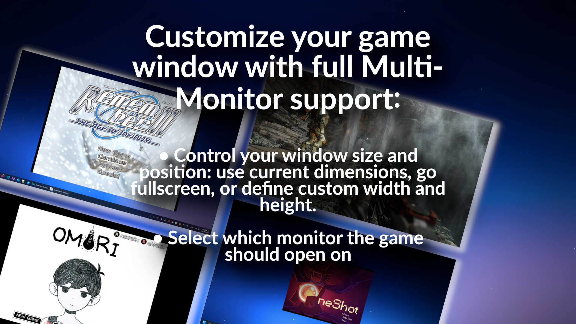 • Custom Positioning and Sizing: Force games to render at a specific position and size on your monitor of choice, giving you full control over your gaming window.