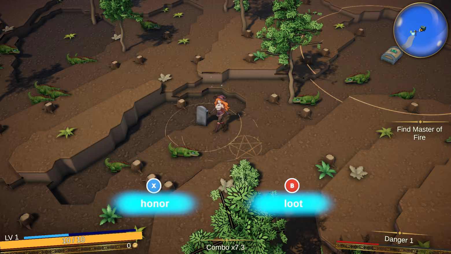 Ваши атаки срабатывают автоматически в направлении стика, позволяя сосредоточиться на уроне, уклонениях и исследовании мира. С каждым уровнем выбирайте новую карту способности из сотни с лишним — повторяемость гарантирована!