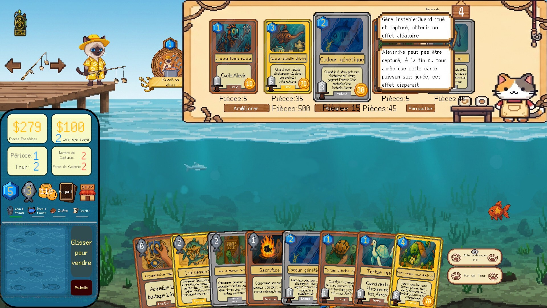 FishingCard est un jeu de cartes Roguelike où les poissons ne sont pas seulement des poissons, mais aussi des cartes. Dans le jeu, vous incarnez un petit chaton qui n'a pas les moyens de payer sa pâtée, et vous embarquez dans une aventure de survie mêlant stratégie et chance, qui s'étend sur 6 périodes pour un total de 24 tours. L'objectif du joueur est de construire un écosystème d'étang capable de générer de l'argent de manière durable pour payer le coût sans cesse croissant de la nourriture pour chat.