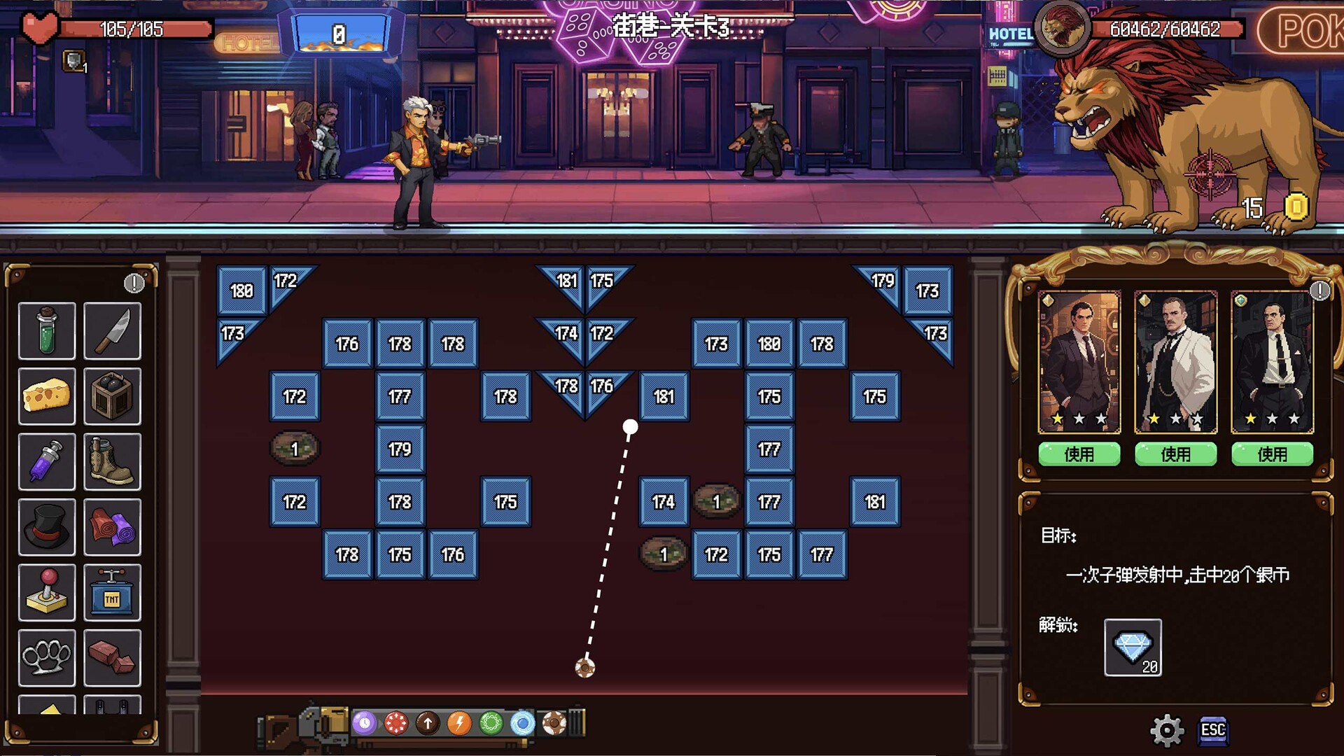 《一枪头!》是一款融合柏青哥、肉鸽与回合制策略的独特弹珠策略游戏。收集千奇百怪的子弹与装备,搭配传奇黑帮大佬的强力支援,精心规划你的弹射路径与发射序列。扣动扳机,上演一场酣畅淋漓的弹幕盛宴,一枪清台!