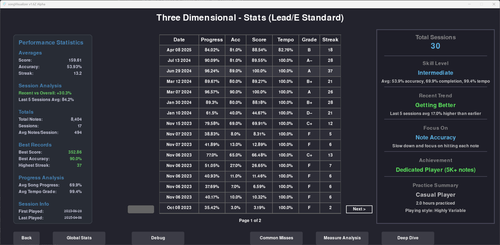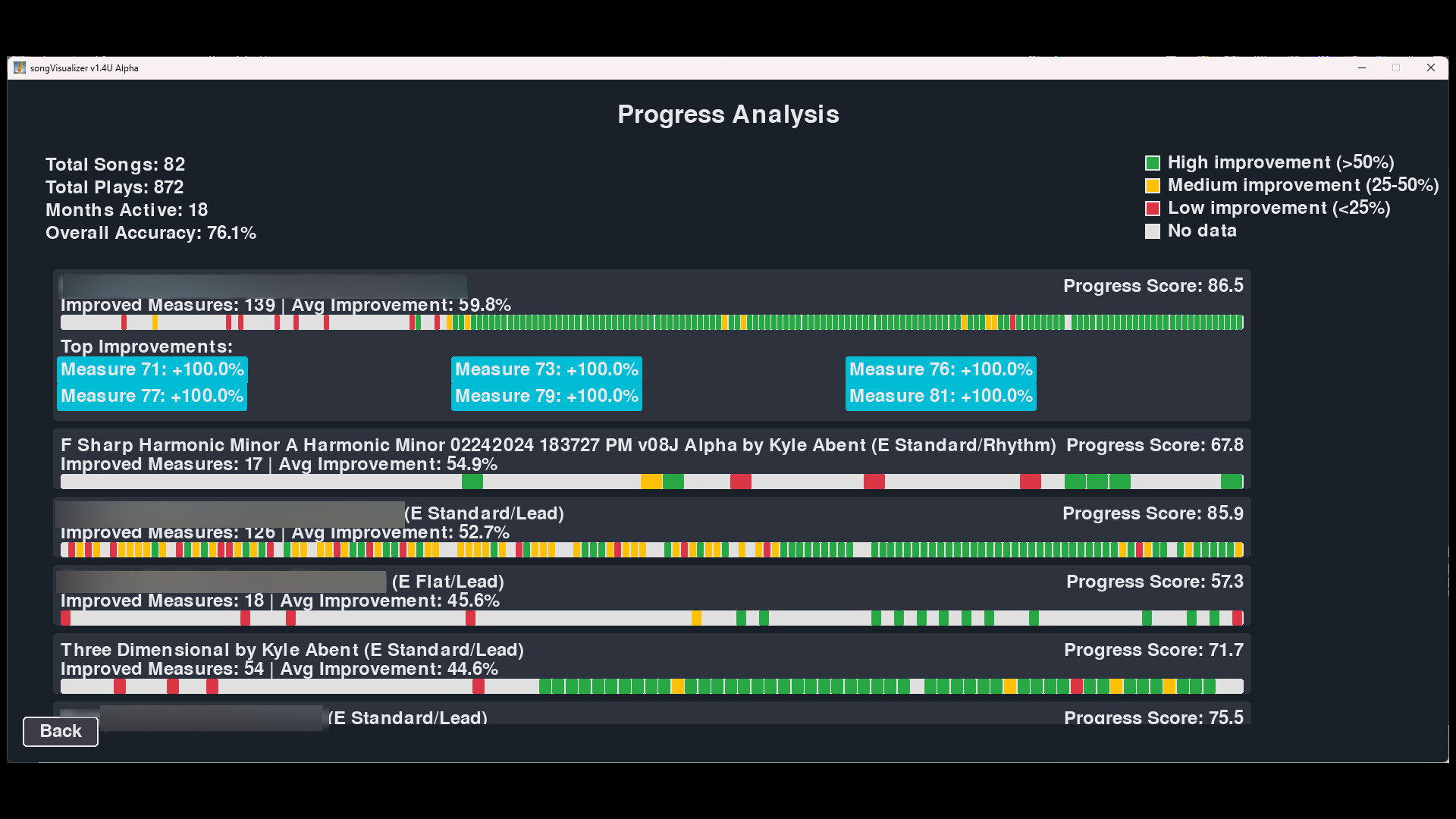 Whether you're perfecting that challenging solo or working through your favorite album, SongVisualizer provides the visual feedback and gamification elements to keep you motivated and improving. The application reads standard Guitar Pro 5 files, giving you access to thousands of songs without any built-in music library restrictions.