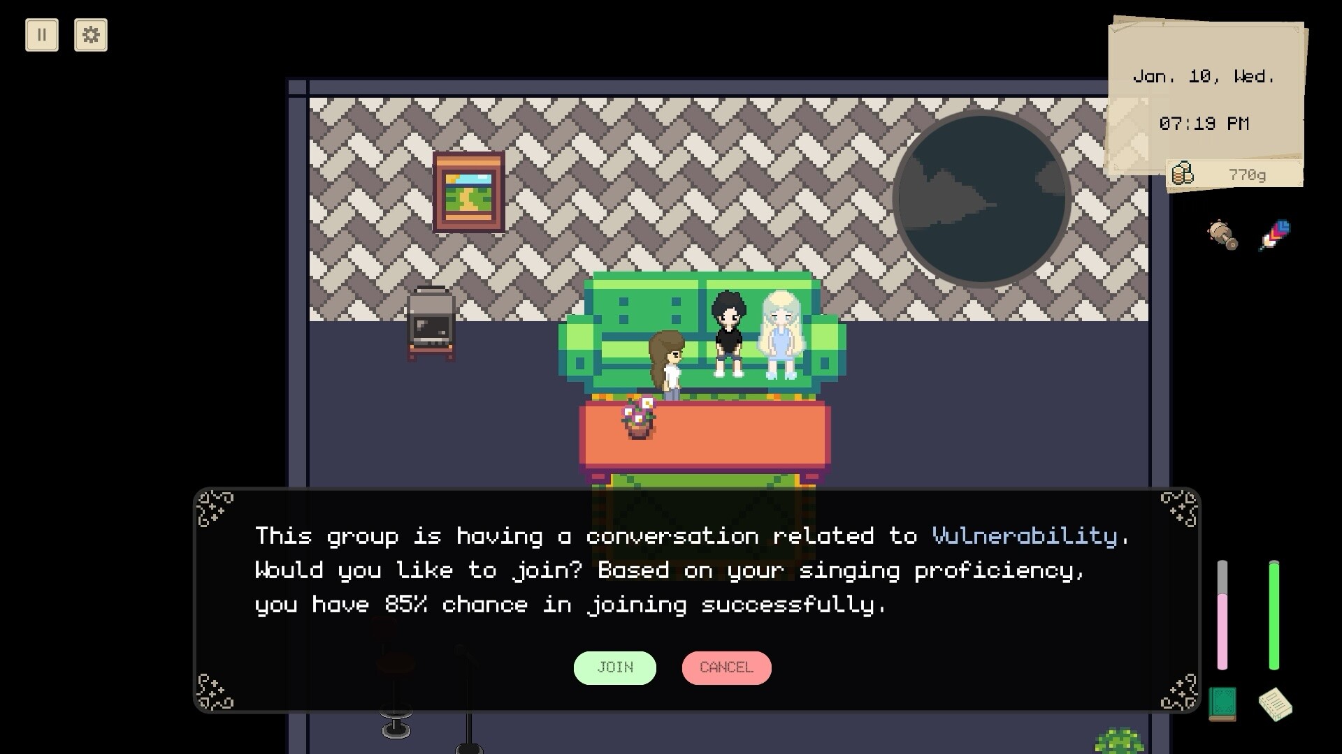 • A Passion Worth Following: Beyond your day job at AlphaCorp, the game introduces five alternative passion paths, each offering a unique gameplay experience. Choose one or more passion paths to explore. Build skills, find mentors, and decode hints of passion hidden in your physical state (happiness/energy) and inner dialogues (diary). Finding your passion can be a challenging game, since your passion might be obscured by limiting beliefs such as "only corporate life pays" or "I'm not good enough", making it appear to be unattractive. However, you will still get hints through action taken in any passion paths, and/or dialogues with like-minded characters.