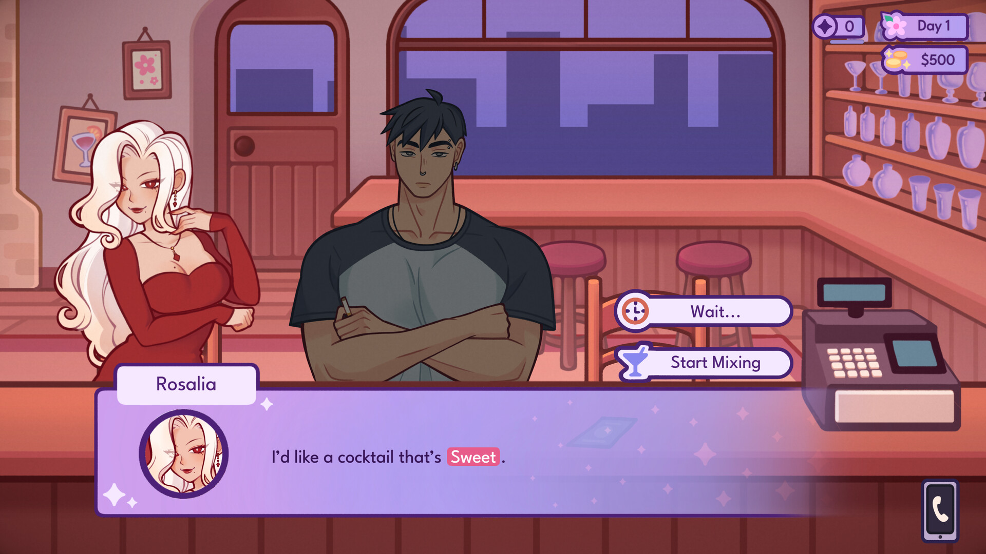 Create original drinks by combining different ingredients with attributes like Sweet, Bitter, Spicy, or Relaxing. The better you match the customer’s desires, the bigger your tip!
