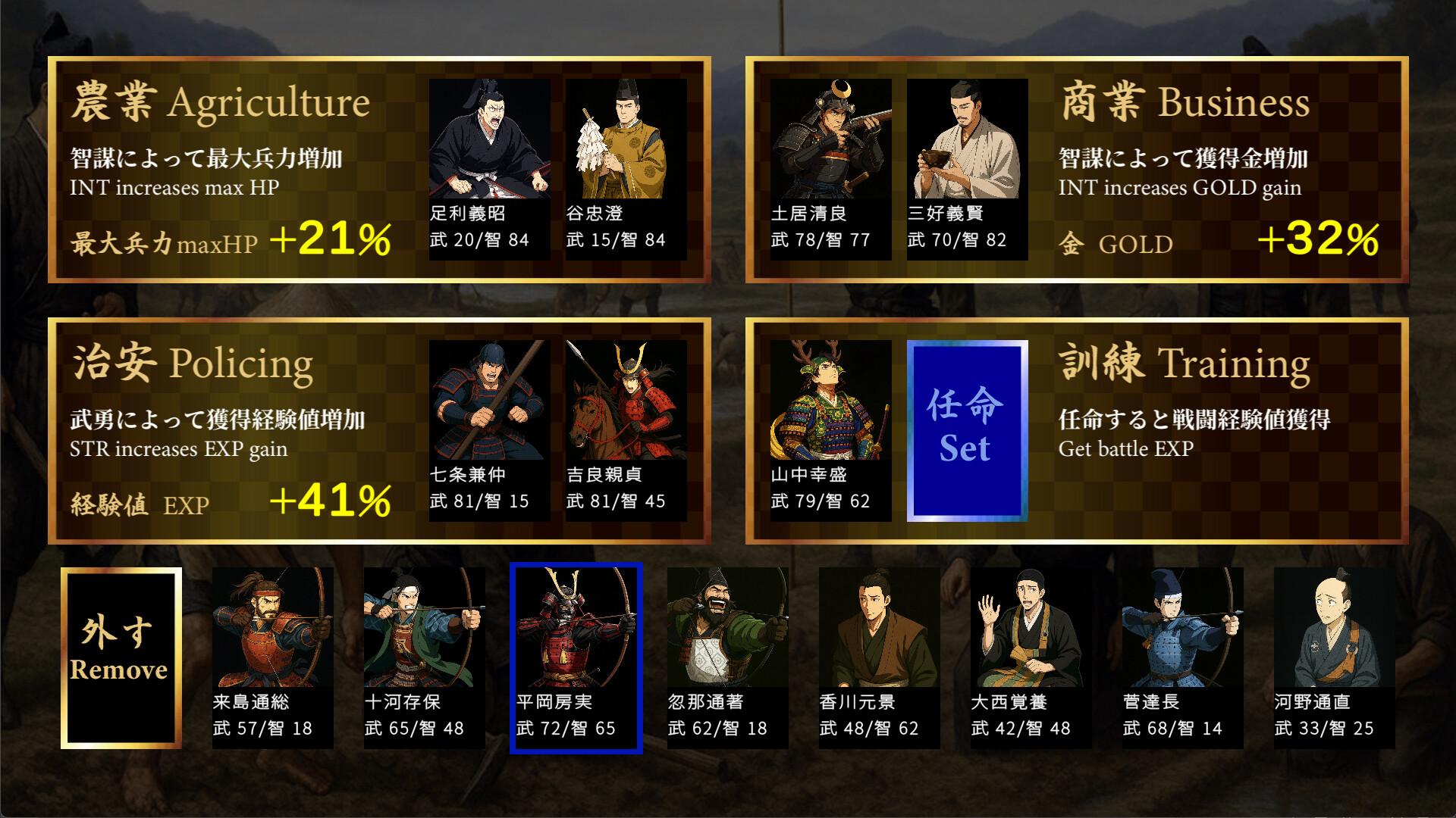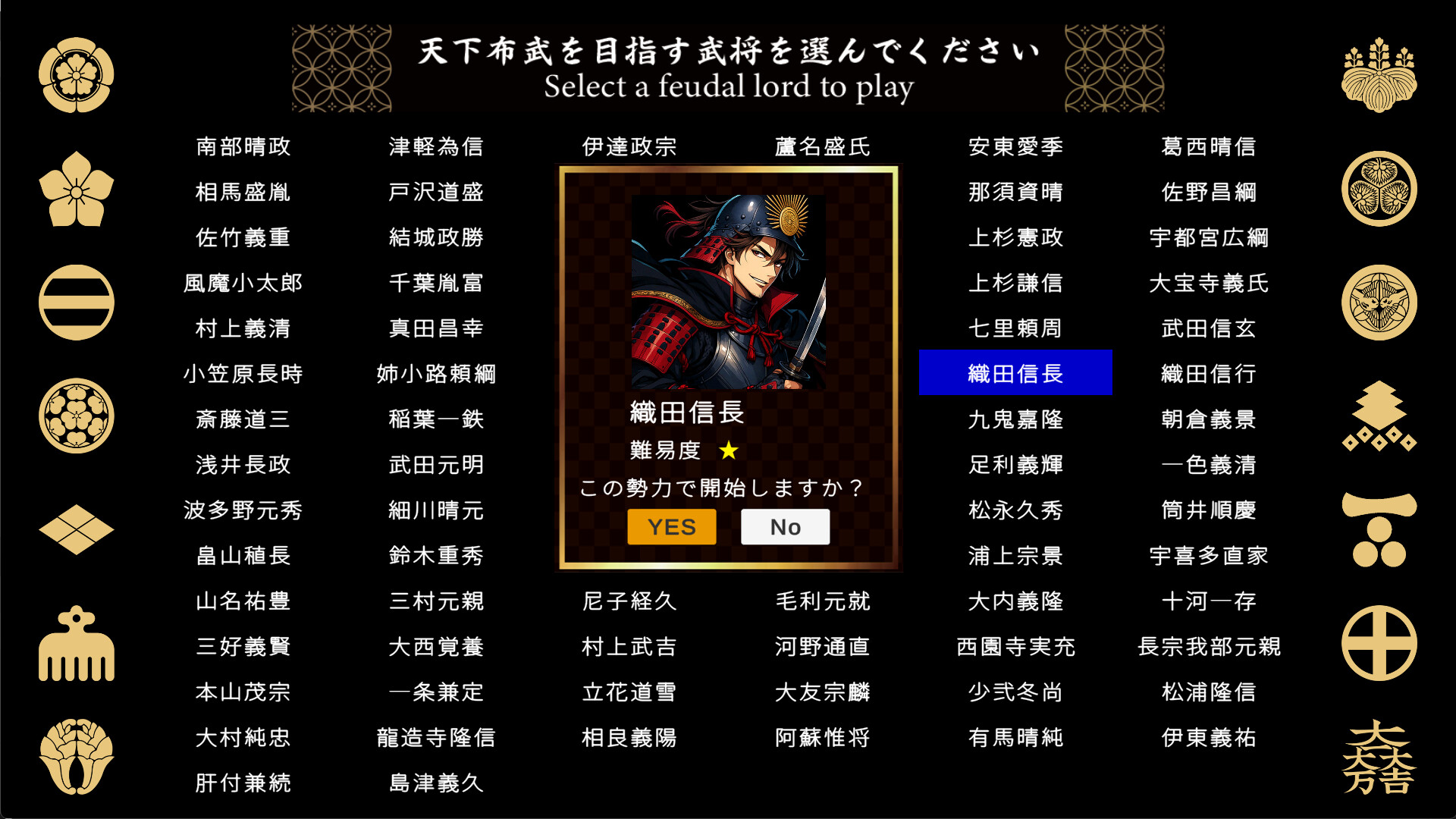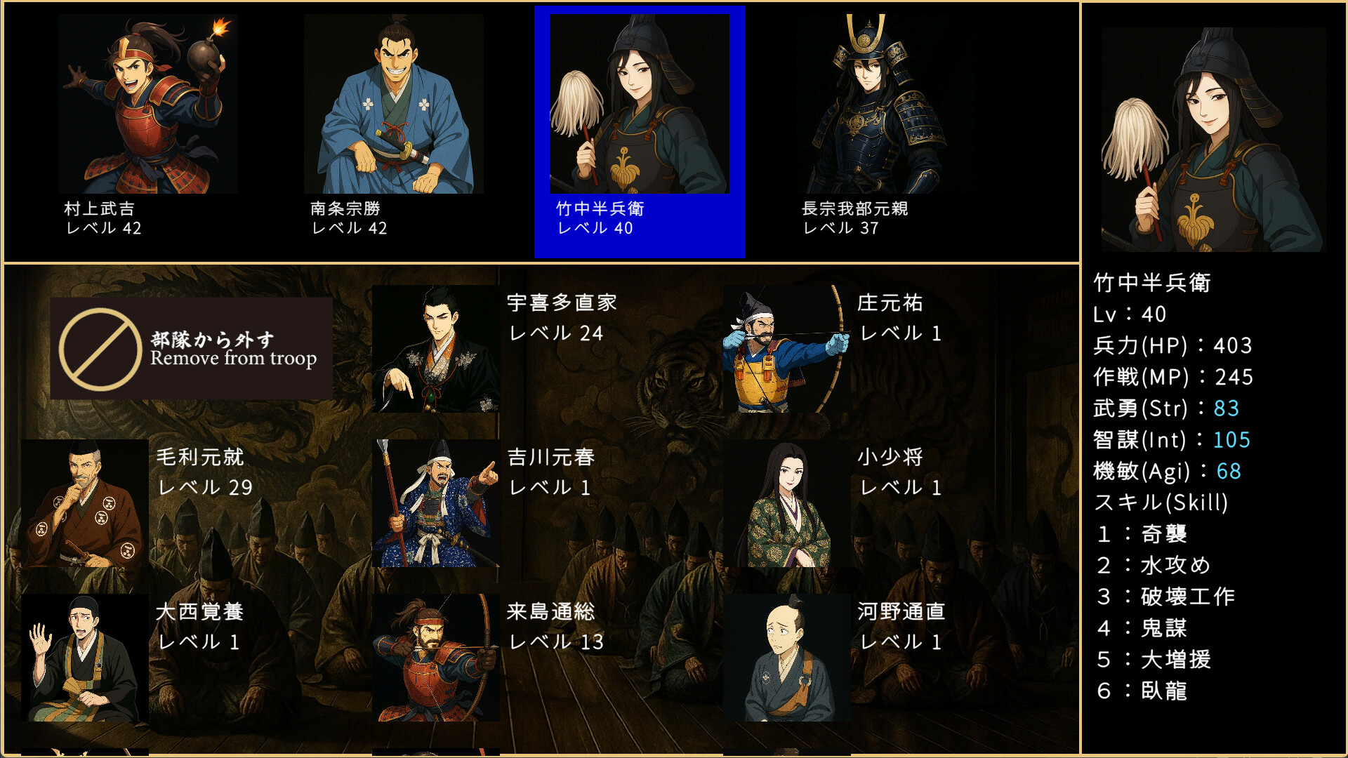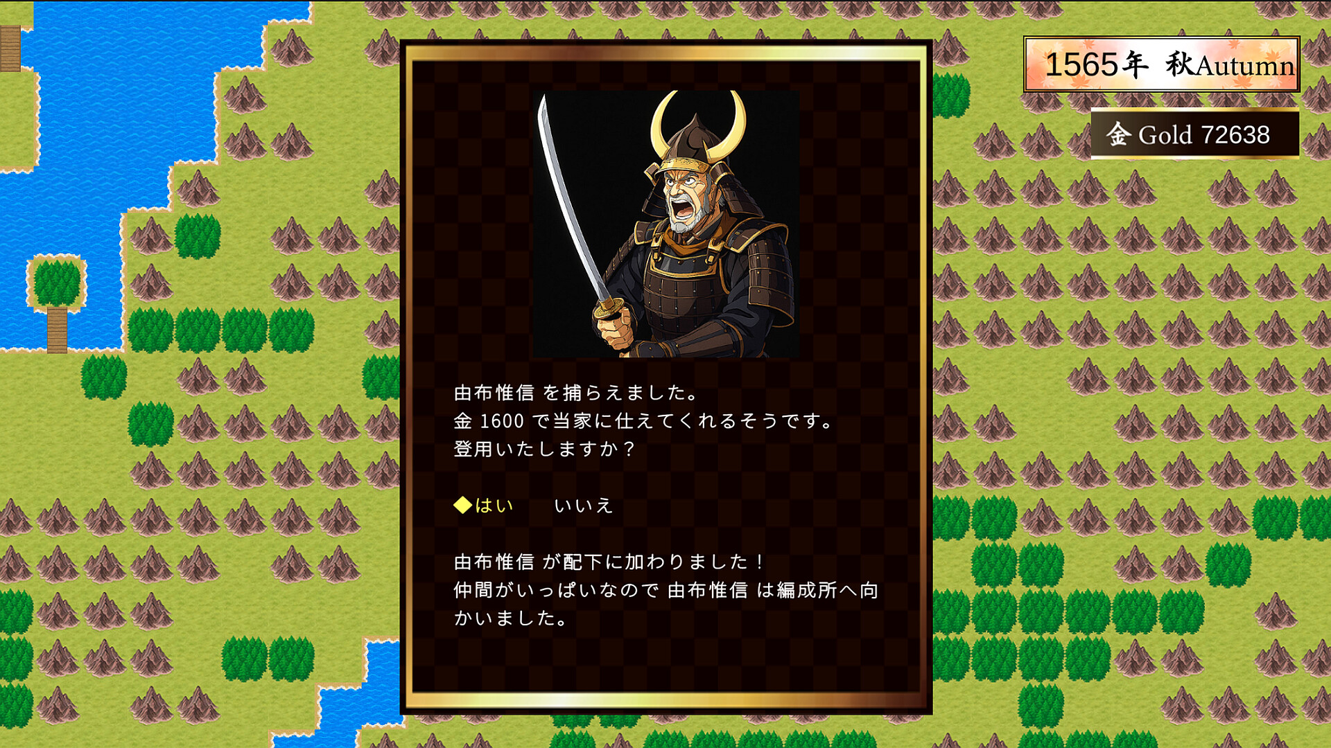 【概要】日本の戦国時代を舞台とした自由度の高いコマンドRPGです。 プレイ可能勢力85以上!登場武将数300名以上!すべてのアイテムに称号と品質のランダム要素! 武将集め・アイテム集め・自由な部隊編成を楽しんでください! 【デザイン】フリーシナリオ・ターン制コマンドRPG