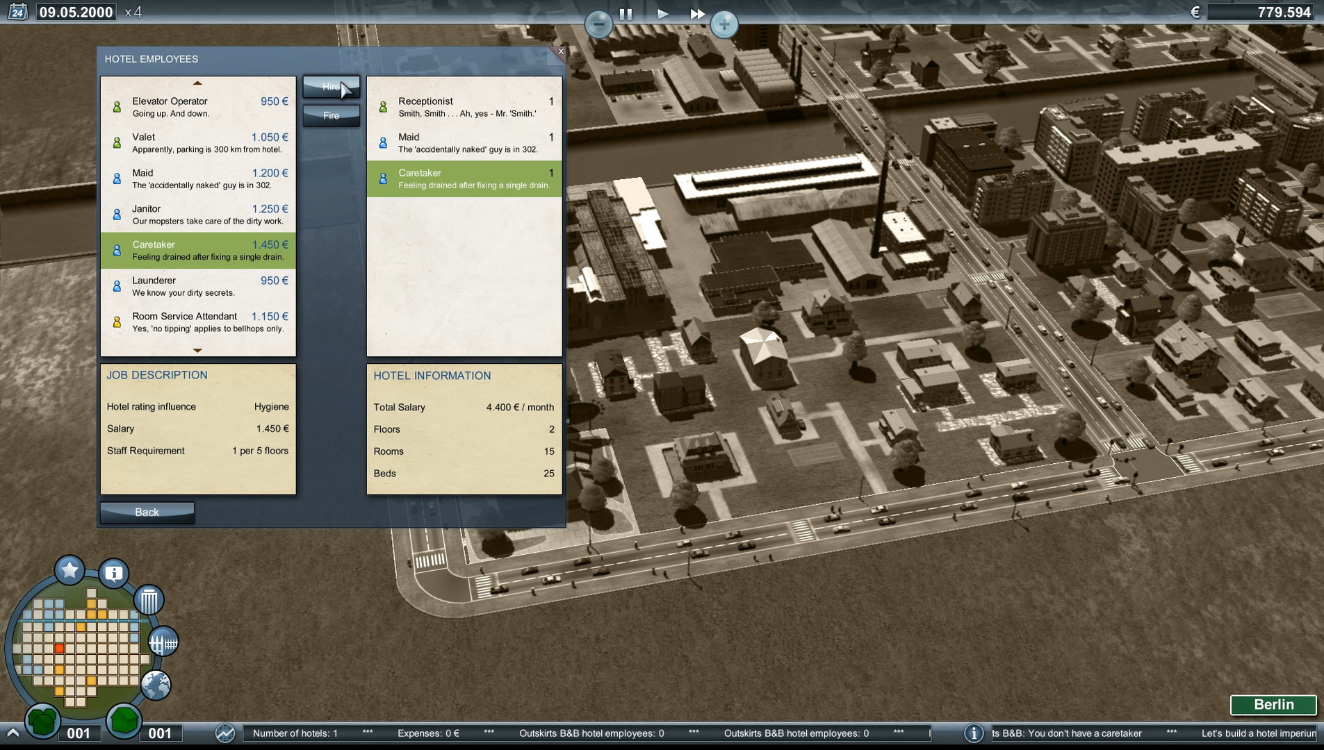 As manager of a hotel emporium the player must make every single decision. It is up to him to decide which employees are hired, which services are offered or how much marketing is needed. The more services are offered, the more starts receives the hotel. As a result the prices can be raised as well. But the quality of services not just raises the prices - also higher costs can be expected. The player must find the balance between services and cost to make his hotel profitable in long terms. As support different advisers guide the player and support him with identifying weaknesses.