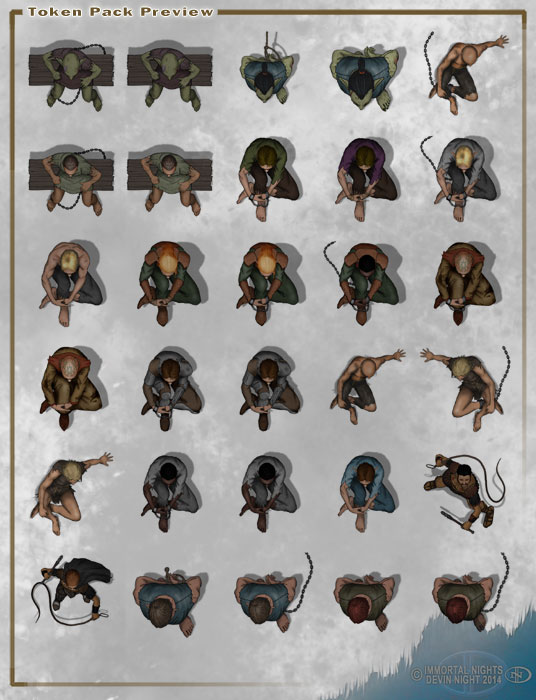 This token pack contains 62 tokens to represent slaves or prisoners. It focuses mainly on human and elven characters.