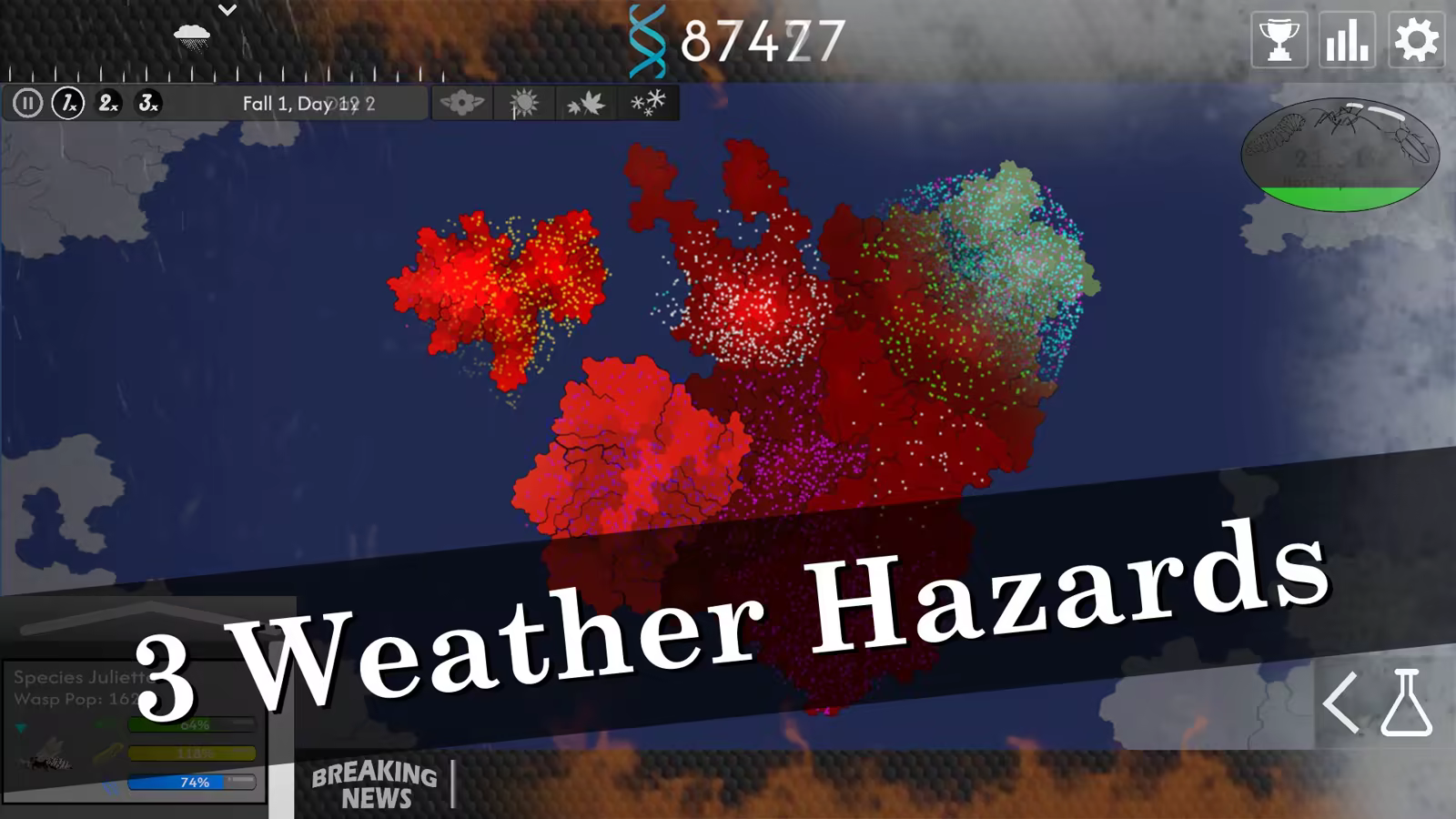 Design and deploy a variety of specialized wasps to target different invasive species, adapting to changing seasons, terrain types, and resistance patterns. From alpine meadows to desert canyons, each biome presents unique challenges and different pest insects that require careful planning and scientific precision. Create the most efficient and effective parasitoid wasps to save the national park and restore ecological harmony.