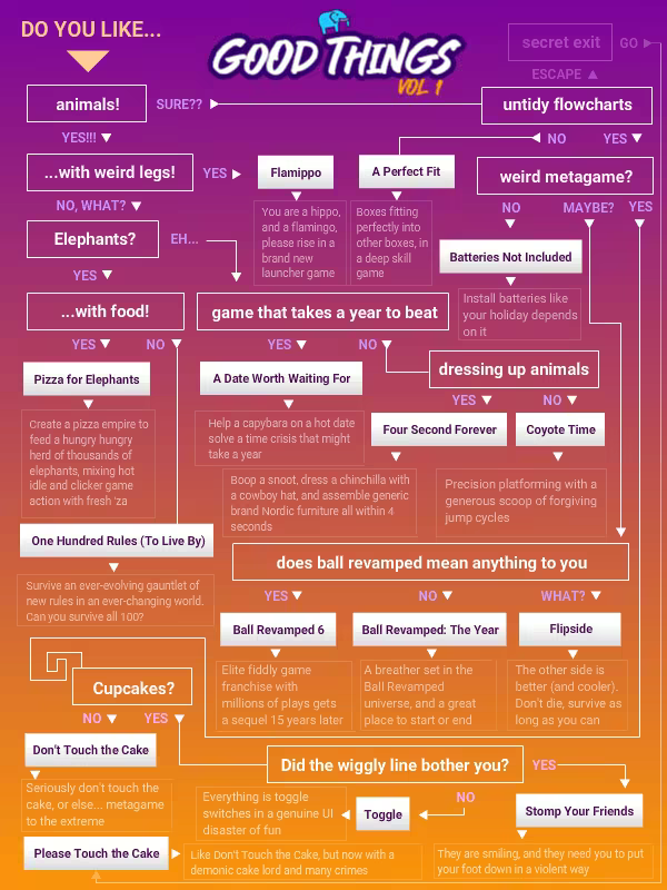 Good Things Vol 1 is a collection of 15 wildly imaginative, weird little games ranging from evolving platformers to genre-bending adventure... but the Blue Elephant ate all the games, and if you do not help him he will DIE :(
