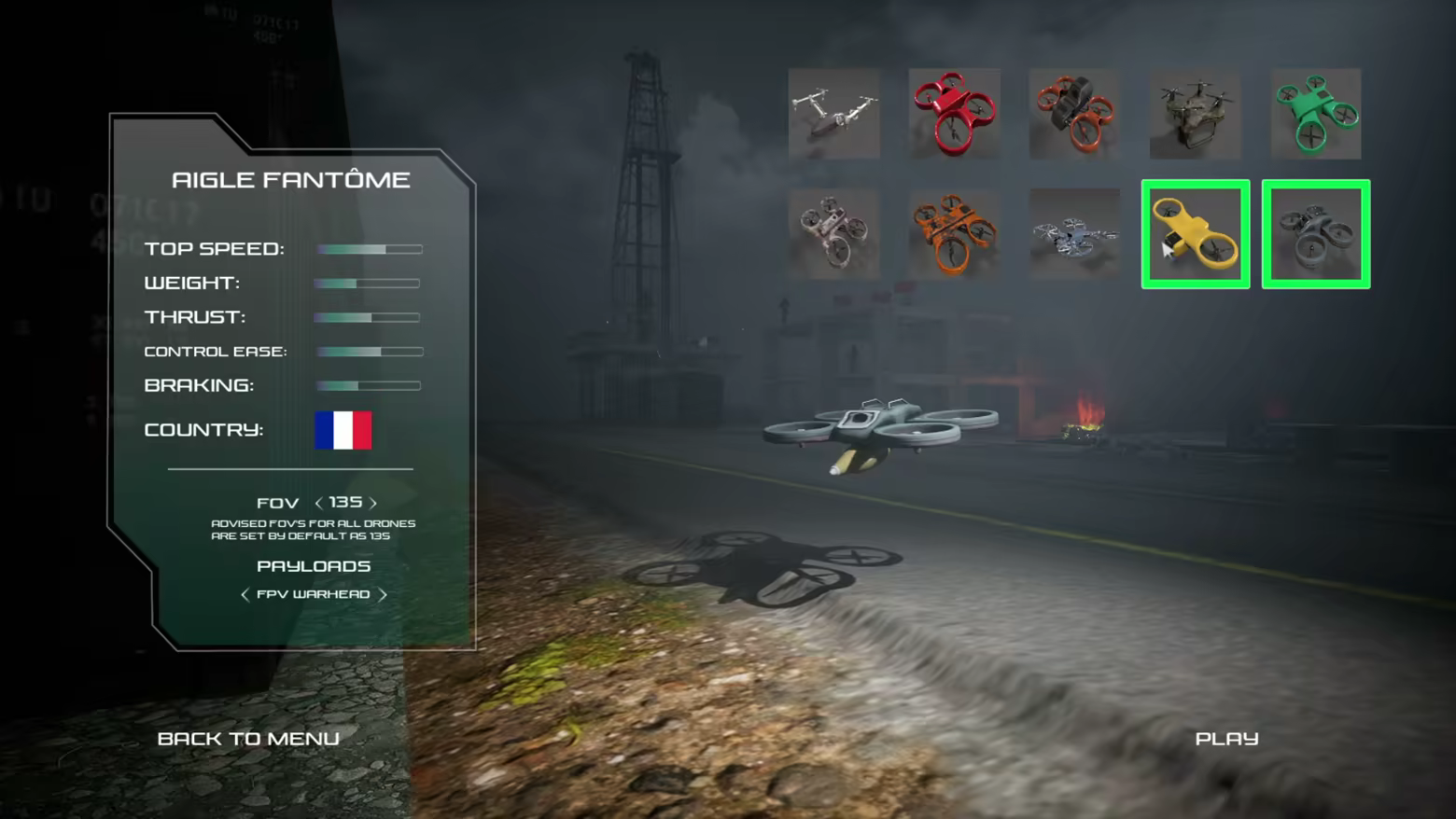 Maîtrisez différents drones, chacun avec des caractéristiques de vol et des charges explosives uniques. Améliorez et personnalisez votre flotte selon votre style de jeu, que vous préfériez des frappes rapides et agiles ou des attaques lourdes et puissantes.