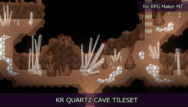Explore deep caves filled with massive crystals thanks to the KR Quartz Cave Tileset! Kokoro Reflections has created an MV/MZ-sized tileset inspired by the incredible Naica Mine, with large stone stalactites and translucent white crystals piercing up through the floor. Send your heroes into a dungeon formed by water and heat and untouched by humans to find large gems that can be used in magical crafting, and add more gorgeous crystals to monster-filled dungeons!