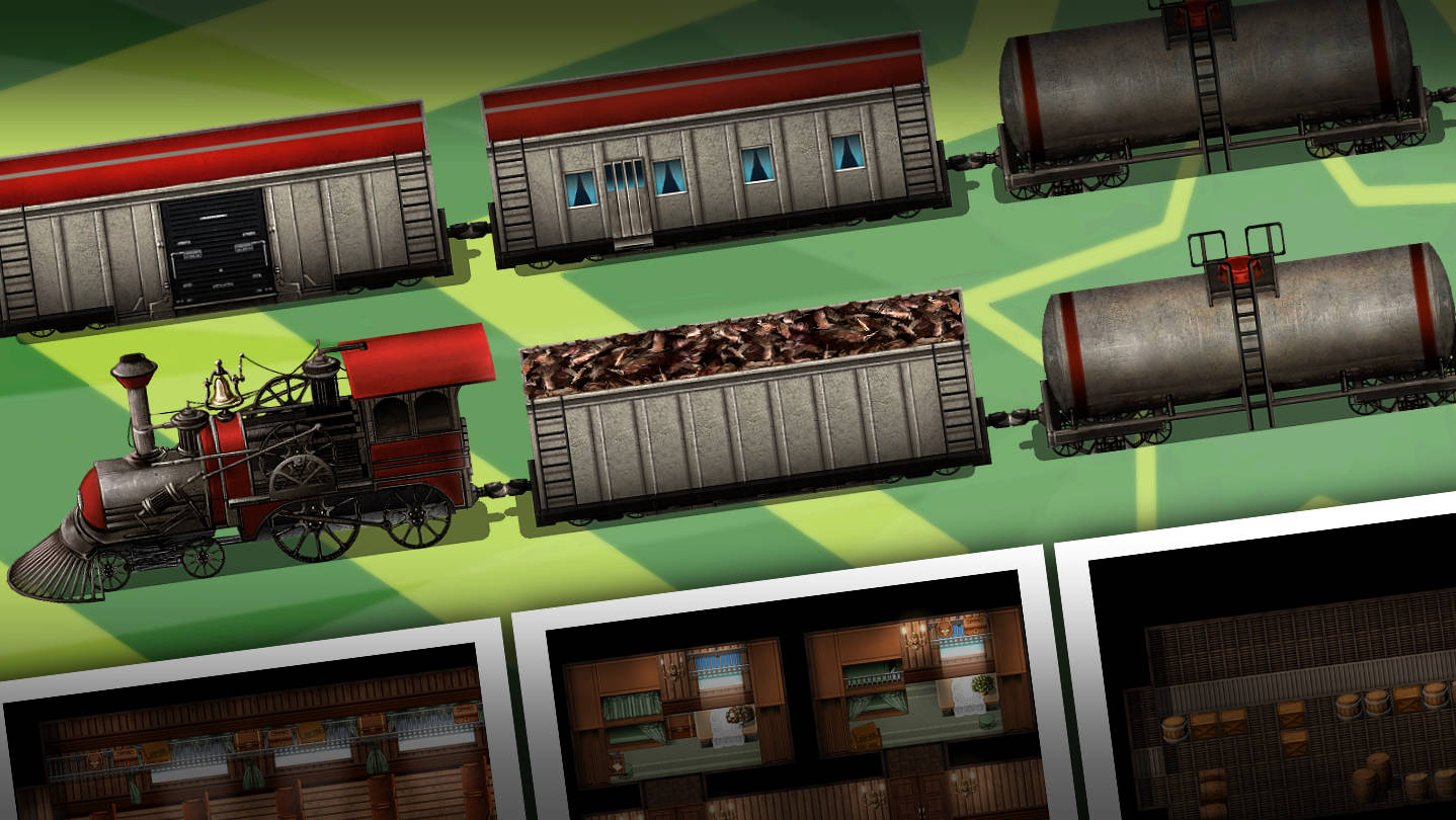 All aboard! Leave navigation to the experts while your heroes rest between dungeons (or solve a murder mystery) thanks to the KR Vintage Steam Train Tileset! Kokoro Reflections is back with another transportation themed MV/MZ-sized tileset to help your heroes get around a large world. Add some train tracks to all of your cities and turn fast travel points into awesome steam trains that roll into town with intricate red and gray locomotives and a long train of passenger cars. Create side quests where your heroes need to keep a train safe while it’s transporting fuel or important NPCs, or just let your heroes wander carriage interiors to choose whether to fully heal with a nap in bunk beds or gain a buff by eating some tasty food in the meal car.