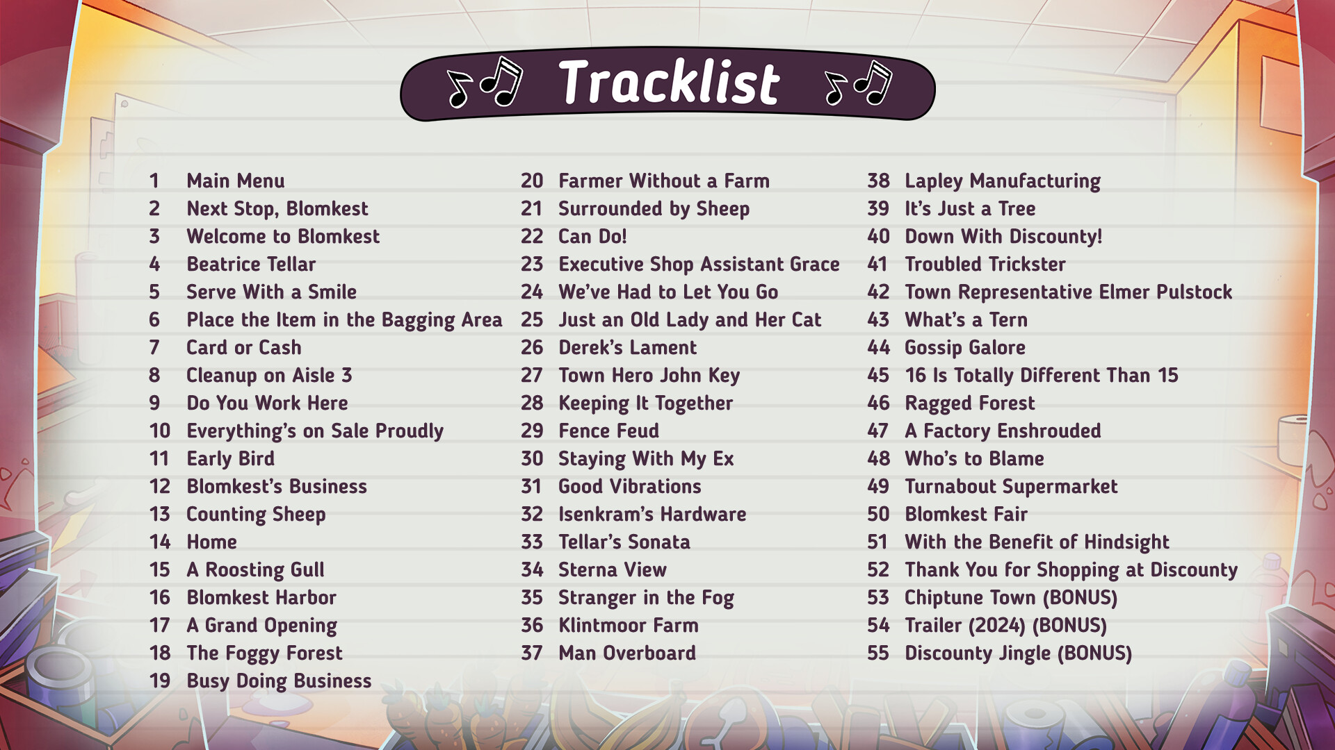 Featuring a mix of over 50 retro melodies, the Discounty soundtrack brings to life the game’s vibrant atmosphere from early morning shelf-stocking to moments of discovery with customers and residents in the game.