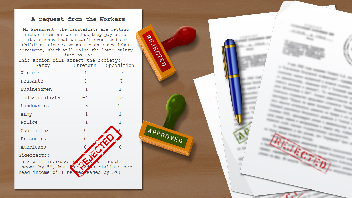 The problems in your plan are the various parties of Risuena's society who also want to benefit and survive throughout your Junta, the Guerrillas who try to seize power, the Americans who support your dictatorship but expect something in return and the next men in power after you, who are waiting for a chance to betray you!