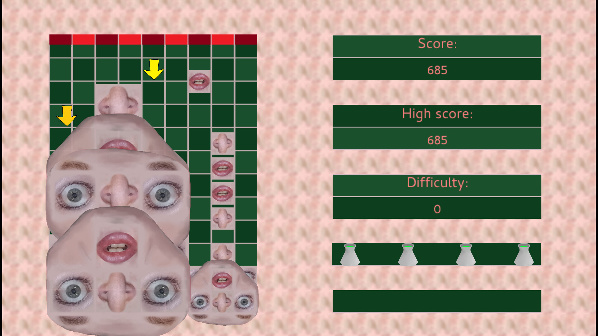 3. Mission mode: Play through a series of levels with different puzzling objectives. Many of these levels have some face fragments pre-placed, and you will have either a set amount pre-determined falling face fragments or a limited amount of time to complete the tasks. Mission examples include emptying the entire screen of face fragments, clearing a specific number of faces at once, killing the caterpillar, and more!