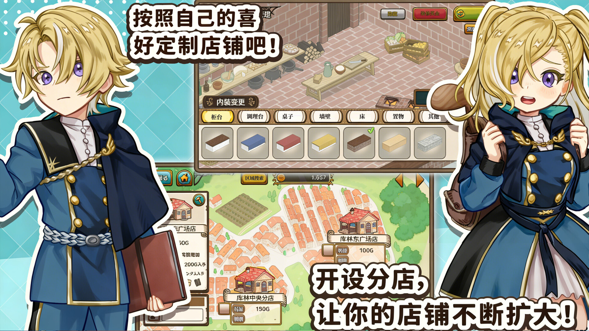 可自定义7大区域布局(柜台、厨房、壁纸等),打造理想主题餐厅。随着探索开启新区域,还可增设分店拓展经营场景。
