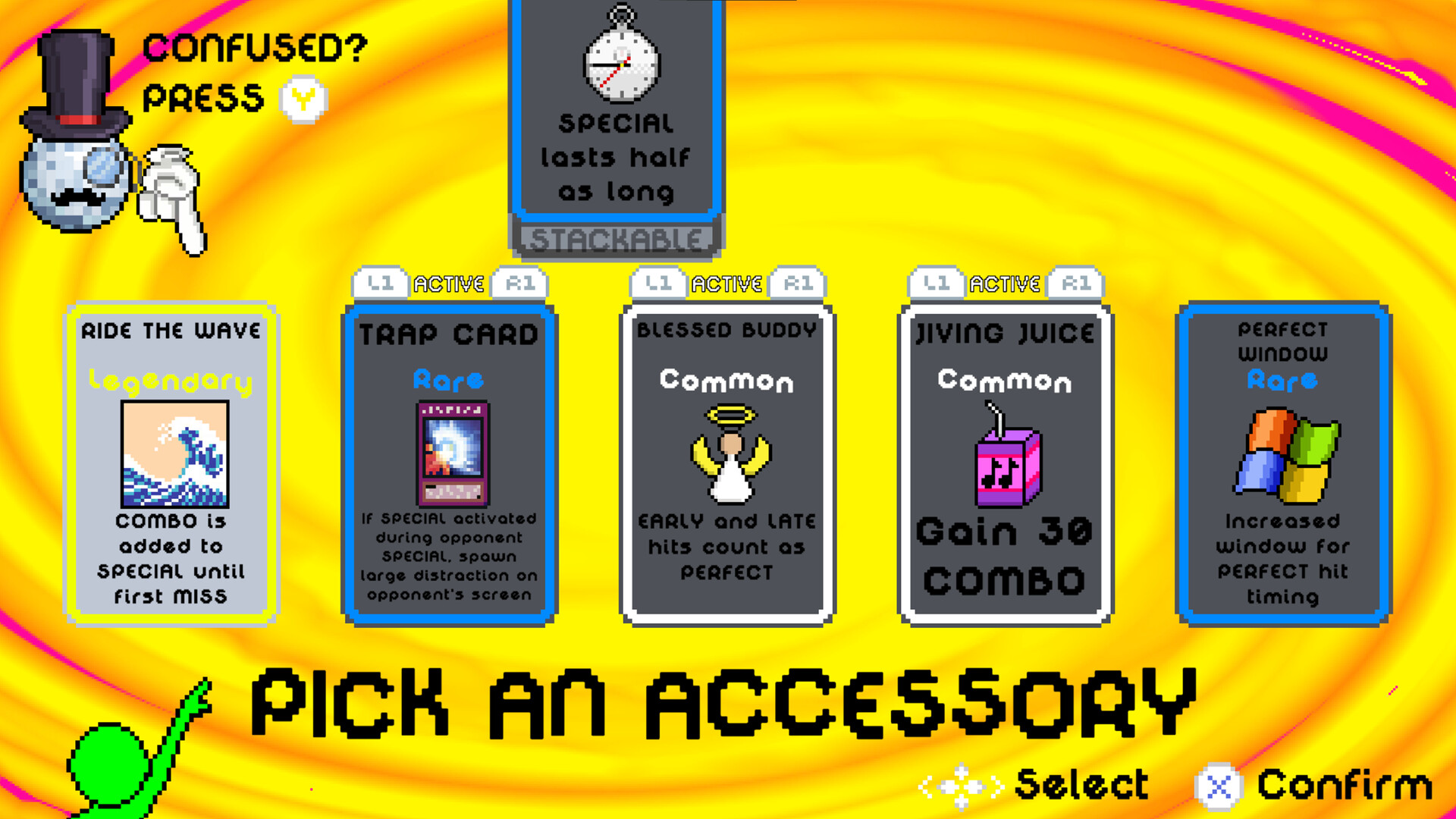 Wacky rhythm action meets roguelike randomness! Every clash shuffles in new buffs and trolls, causing crazy rhythm chaos! Face off in 2-player local PvP and groove to a funky soundtrack with 10 original tracks designed to get you jamming and slamming (your controller!)