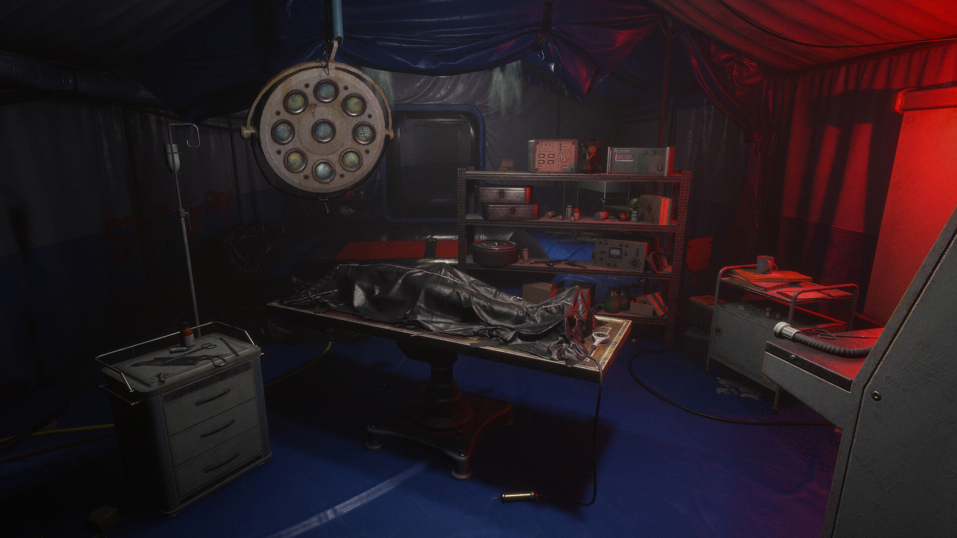 Visuals & Atmosphere – Operation Stutter’s world is steeped in Cold War aesthetics and brutalist architecture, brought to life with the visual language of arthouse cinema inspired by the meticulous framing of Stanley Kubrick. Every environment feels alive — from concrete-clad corridors to flooded chambers, from sterile research labs to oppressive underground shelters. The interplay of light, shadow, and color creates a cinematic unease that reflects the story’s themes of paranoia and isolation.
