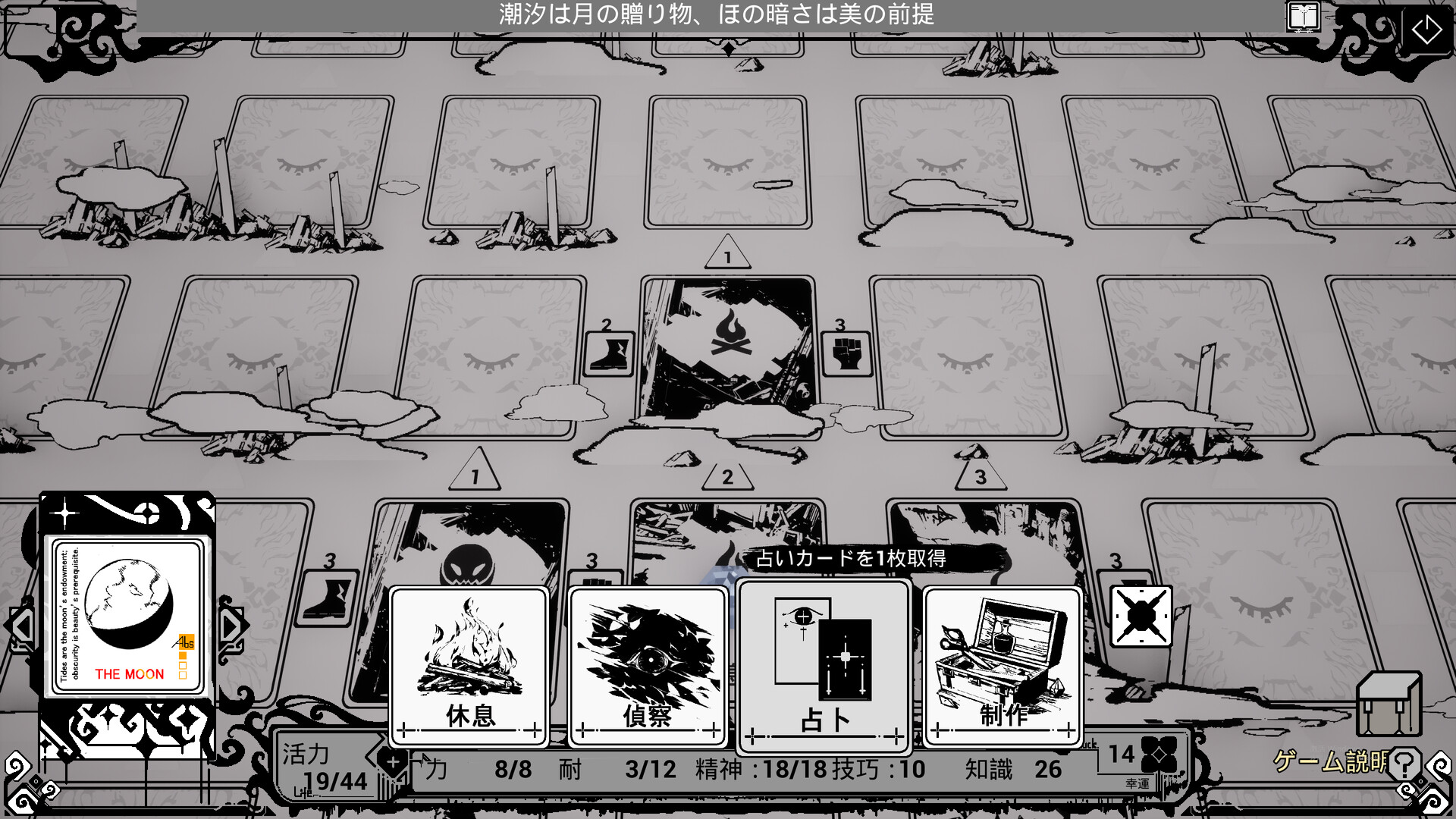 ターン制ゲームで、プレイヤーはカードを駆使して戦術を最適化しながら攻略を進めます。モノクロームのビジュアルと神秘学的テーマがゲームの基調を構成しています。