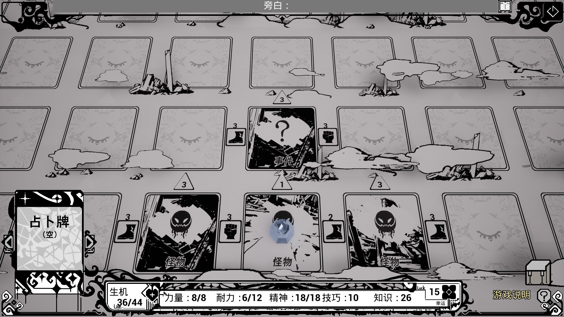 这是一个回合制游戏,玩家通过合理使用卡牌优化战斗策略进行攻略,以黑白和神秘学作为游戏的主基调。