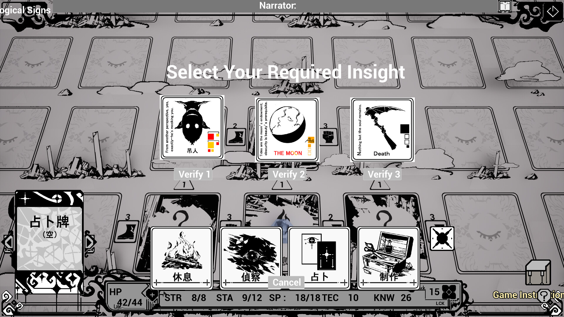 This is a turn-based game where players strategically optimize combat tactics through rational card usage. The game's core aesthetic blends monochrome visuals with occult themes.
