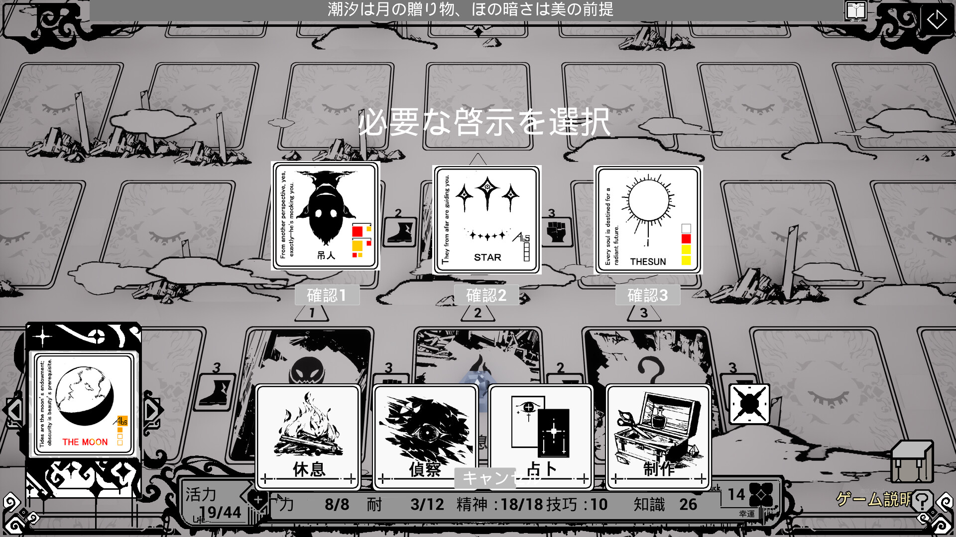 ターン制ゲームで、プレイヤーはカードを駆使して戦術を最適化しながら攻略を進めます。モノクロームのビジュアルと神秘学的テーマがゲームの基調を構成しています。
