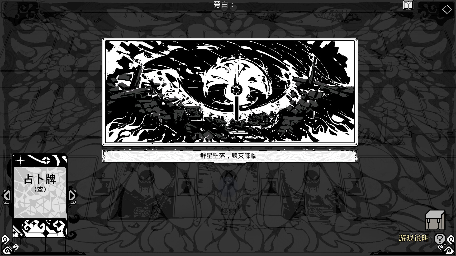 这是一个回合制游戏,玩家通过合理使用卡牌优化战斗策略进行攻略,以黑白和神秘学作为游戏的主基调。