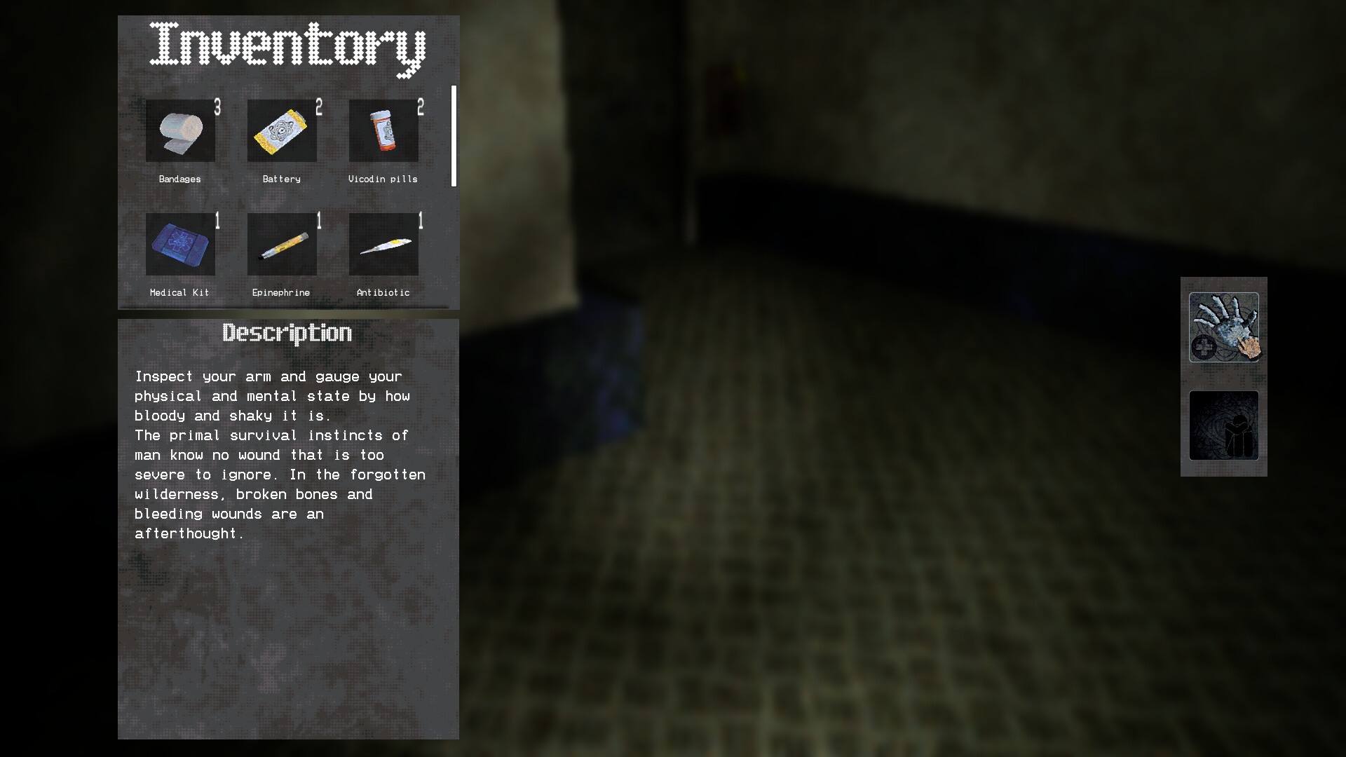 There is no health bar. Inspect your arm carefully and use different cues to assess your physical and mental health. Death can creep up on you in insidious ways, never let your guard down.