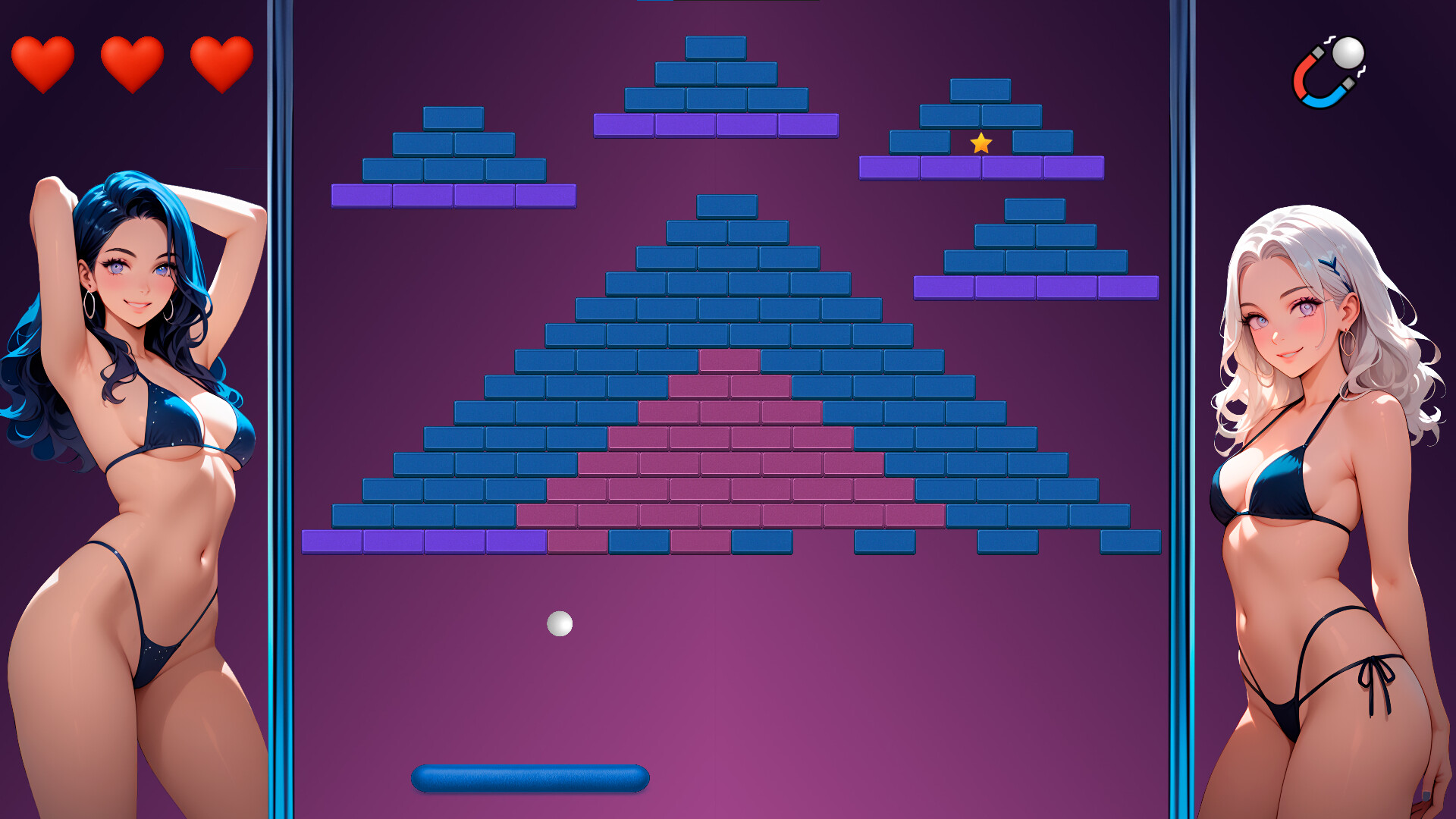 Girls Seducer is a sexy reimagining of the classic brick-breaking arcade formula — now with a flirtatious reward system. Shatter colorful blocks, master tricky ricochets, and unveil stunning artwork piece by piece as you climb through levels of increasing intensity.