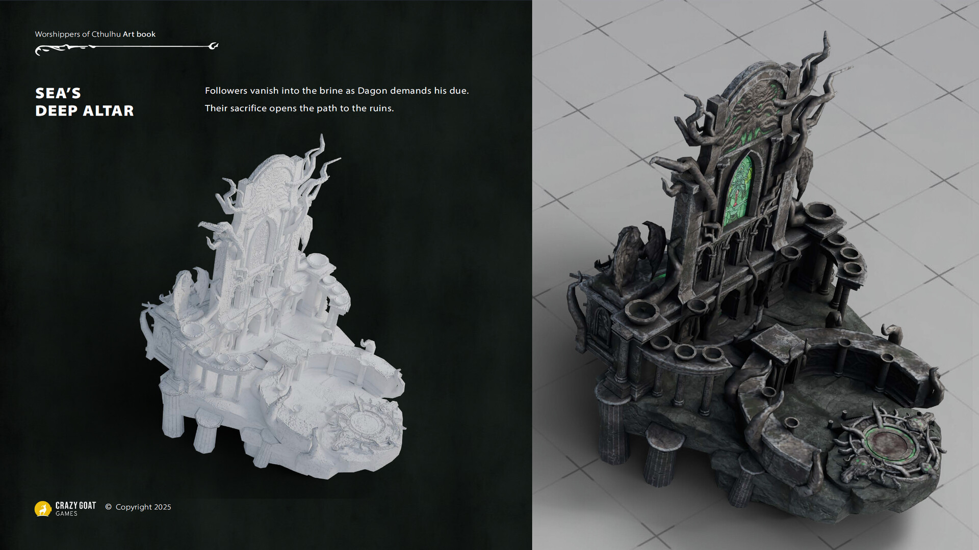 The Worshippers of Cthulhu: Artbook is a 138-page digital collection showcasing the haunting world of the Cult of Cthulhu. This DLC offers an exclusive glimpse into the artistic vision behind the game - from the twisted architecture of cult cities to the otherworldly creatures, eldritch rituals, and the followers who serve the Great Old Ones.